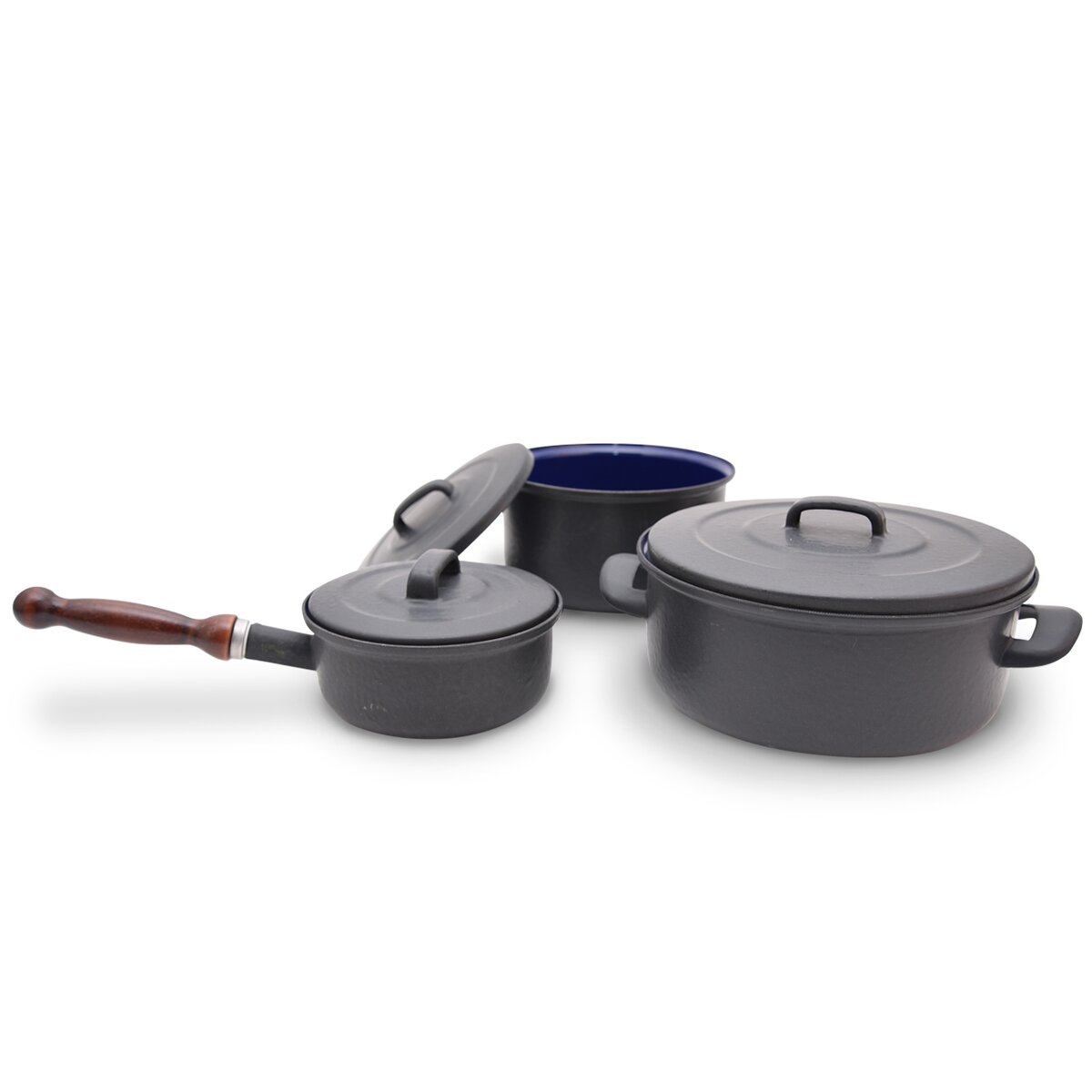 Ocelový základ je pokryt smaltem, což je tavenina podobná sklu a vytvoří tak odolný, zcela zdravotně nezávadný povrch. Z vnější strany je matný plastický povrch, s viditelnými stopami po otěru. Po pár použitích se zatáhne a získá klasickou, tmavě černou barvu. Uvnitř je aplikován speciální modrý smalt, který má výborné kyselinovzdorné vlastnosti a zůstává při běžném používání léta prakticky netknutý.