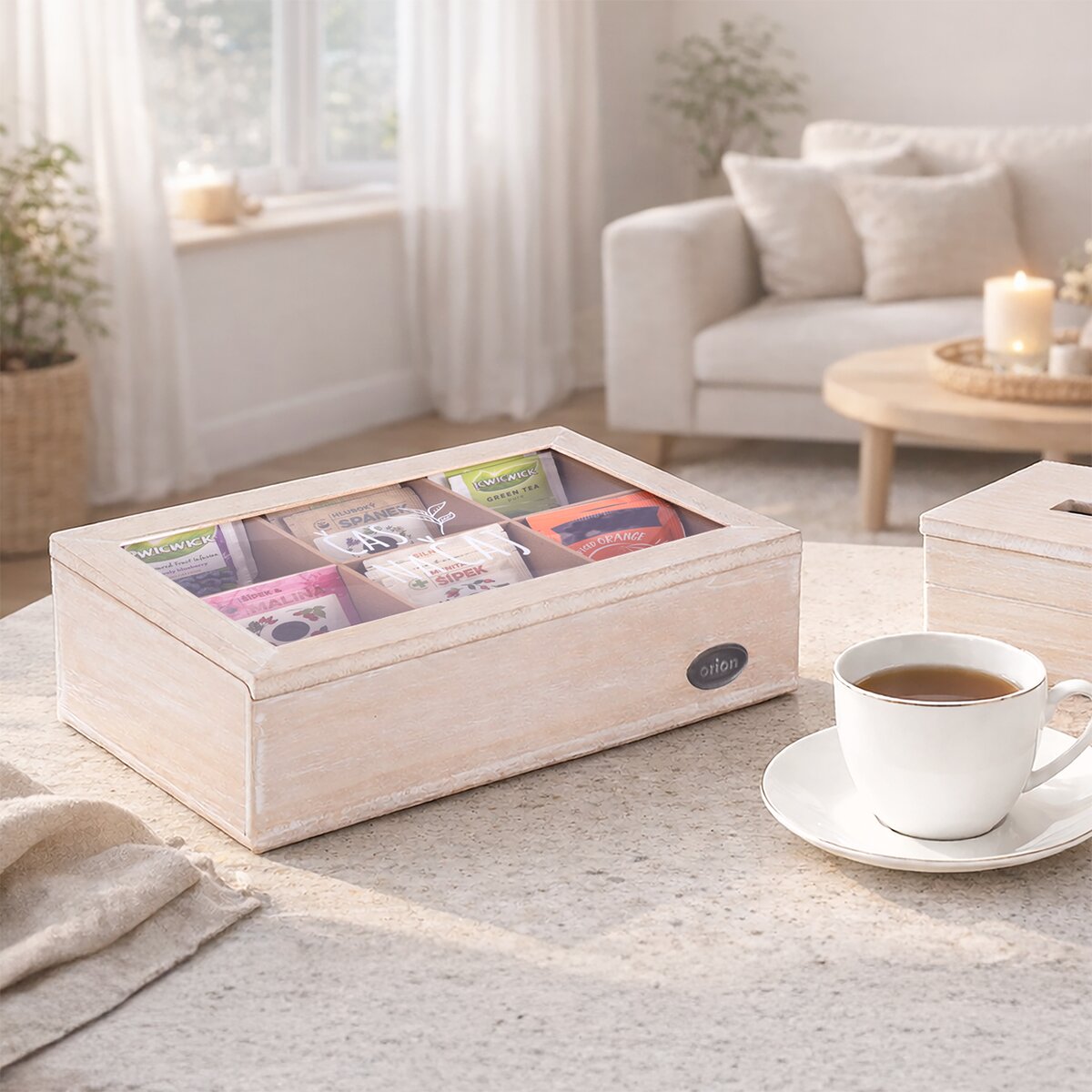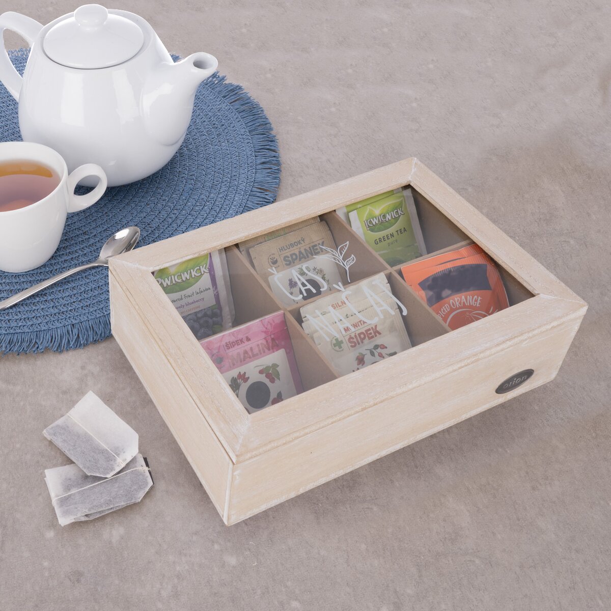 Vašim hostům, kolegům v práci nebo klientům tak můžete stylově nabídnout čaj, který mají rádi. Přírodně zbarvená kazeta s jemnou bílou patinou z MDF desek má velikost 24x16x7 cm a víko opatřené skleněným průhledem s nápisem ČAS NA ČAJ. Ten vznikl v dílně našich Orion designérů. Pohodlné otevírání a zavírání zajistí kovové panty.