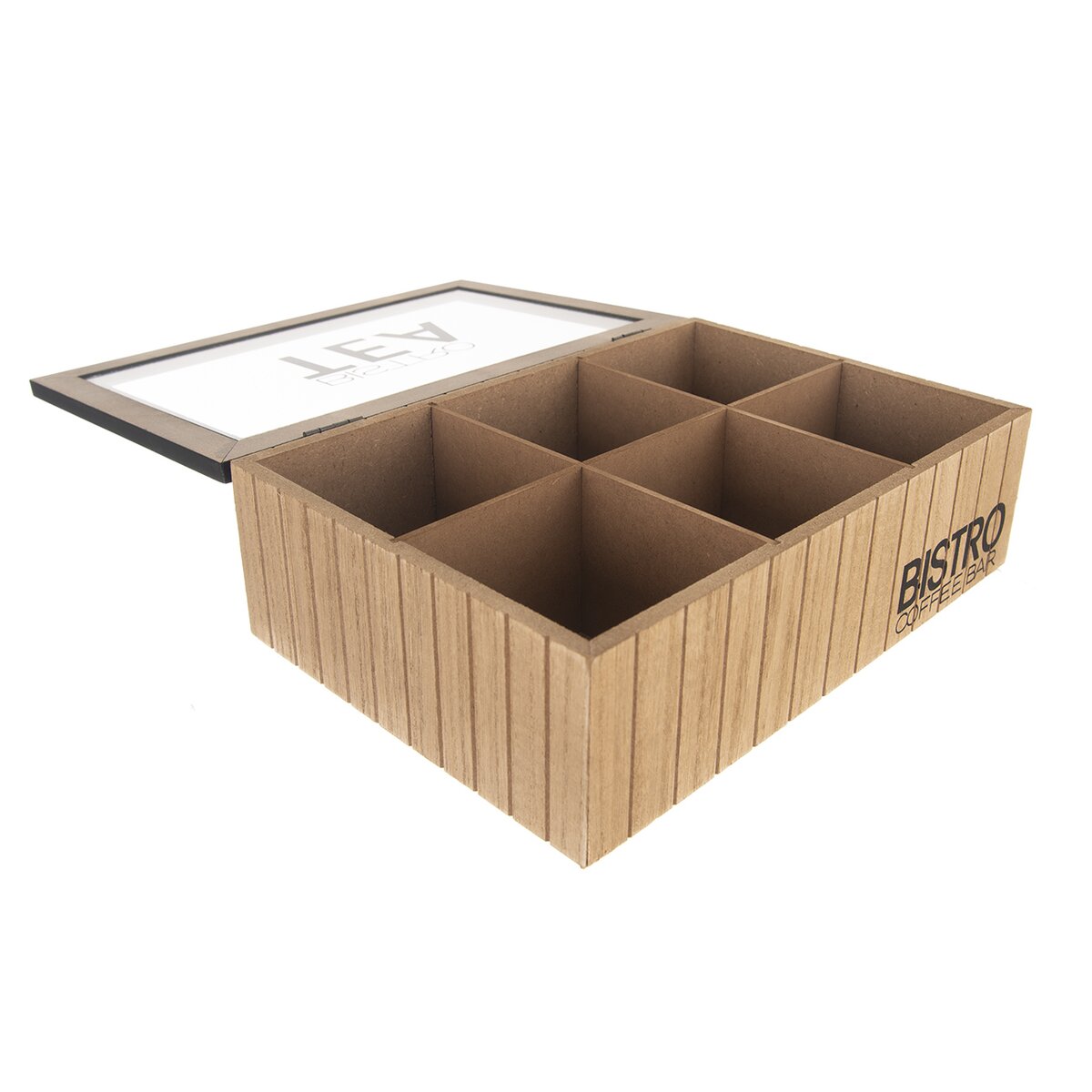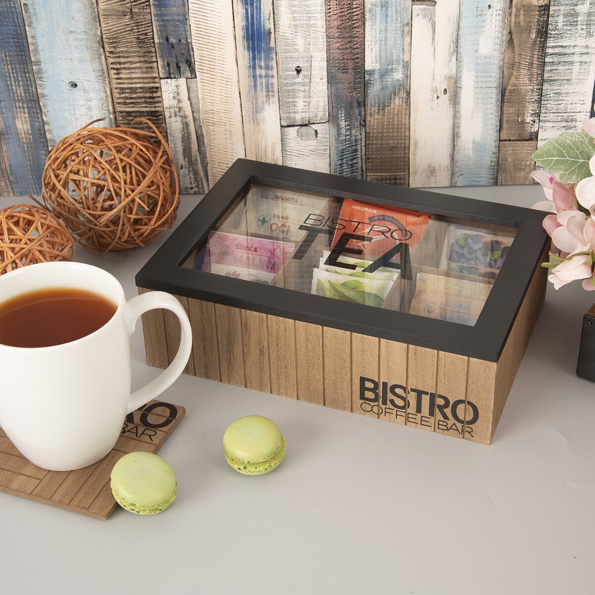 Kód produktu 127183Stylová kazeta BISTRO na čajové sáčky je rozdělena do 6 sekcí, je vyrobena z dřevovláknité desky a uzavřena bukovým víkem se skleněnou výplní.