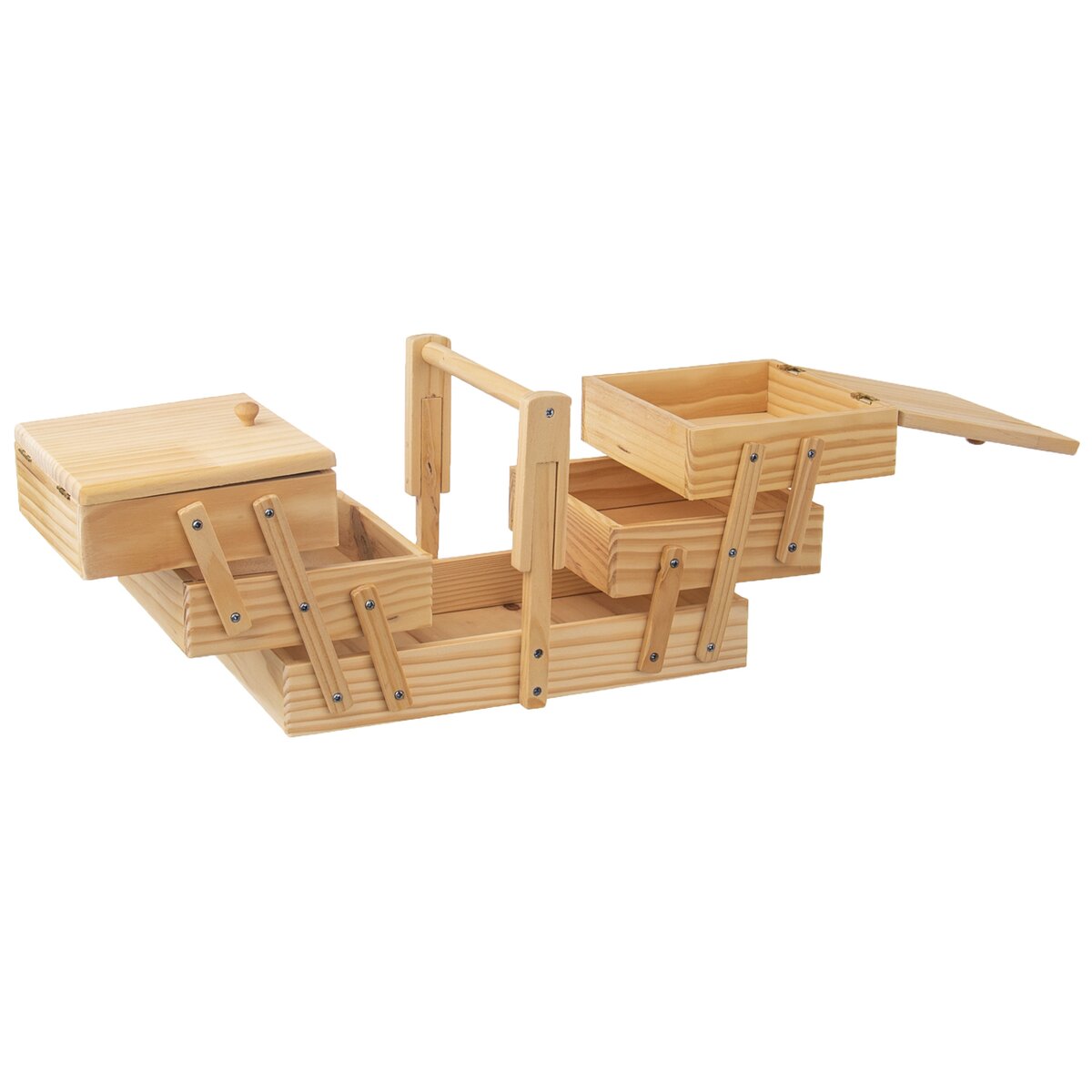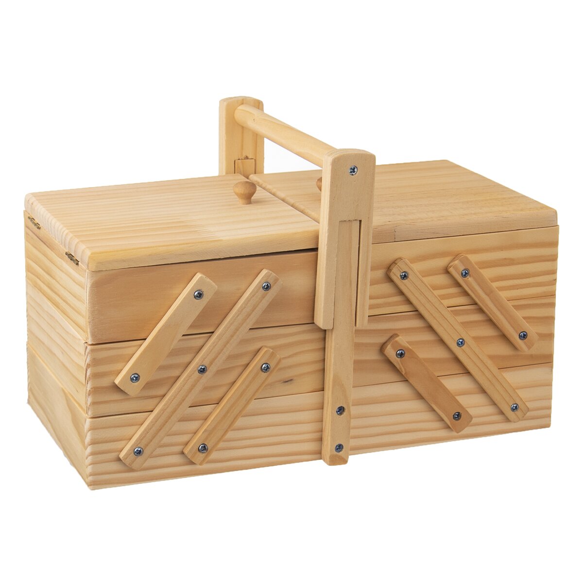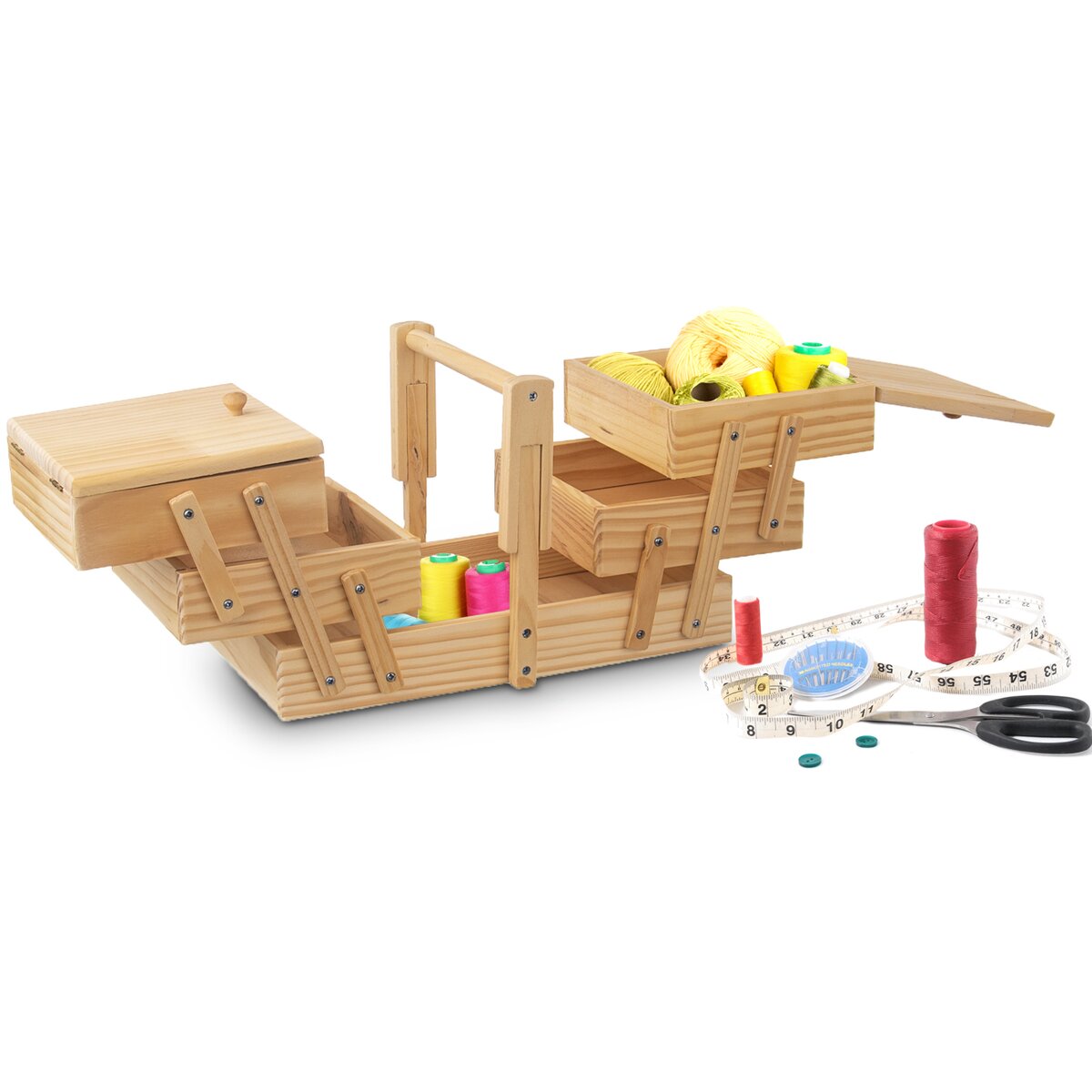 Kód produktu 126030Dřevěný box s výklopným systémem jednotlivých pater do stran je určen k uspořádání různých šicích potřeb a drobných předmětů nejen pro kreativní práci.