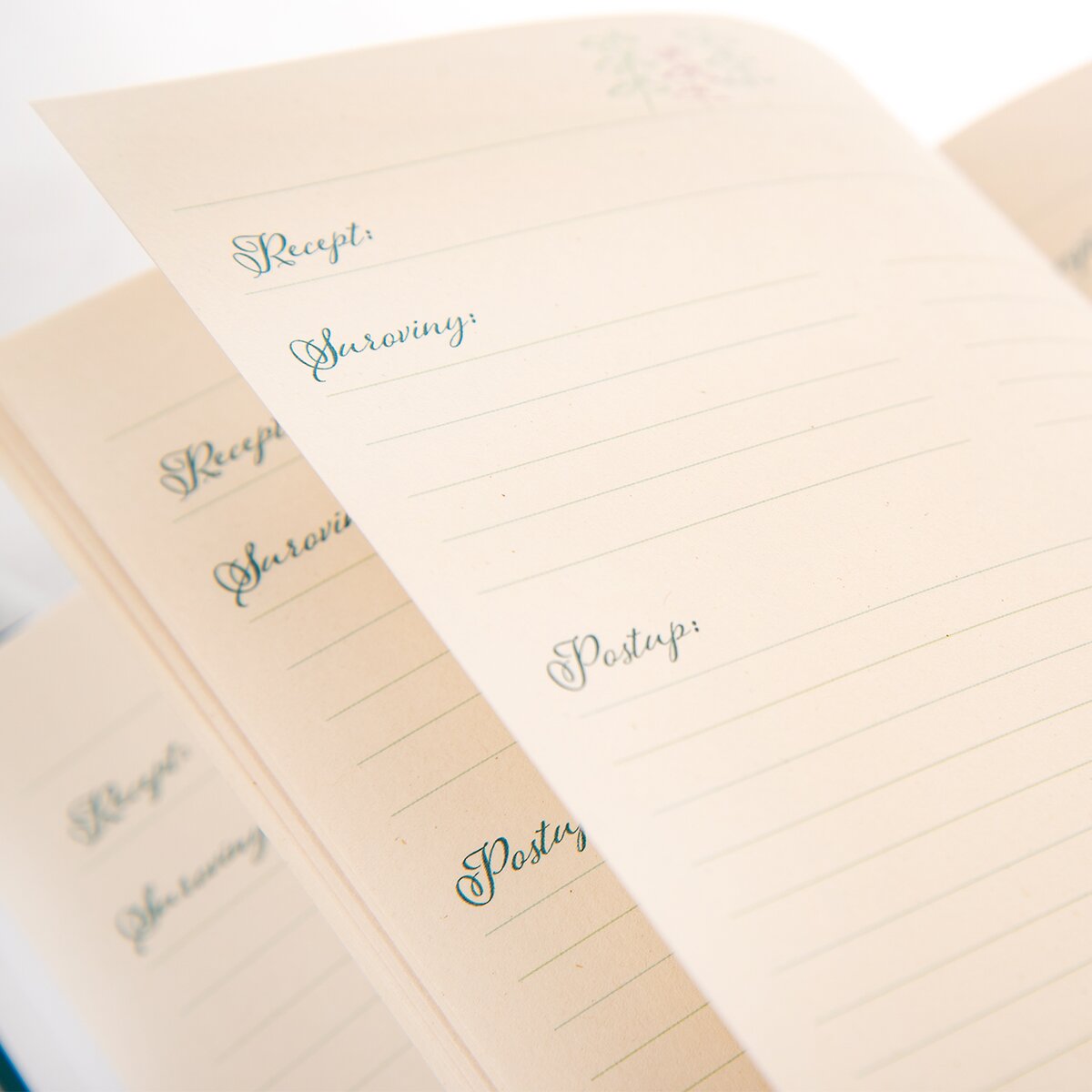 Má 180 předtištěných stran v tuhé vazbě, kam lze psát název receptu, suroviny i postup přípravy. Bude tak krásným dárkem pro všechny, kdo mají rádi podobu ručně psaných kuchařek, nebo jako odkaz pro dceru nebo vnučku, která má za sebou první pokusy uvařit něco dobrého.