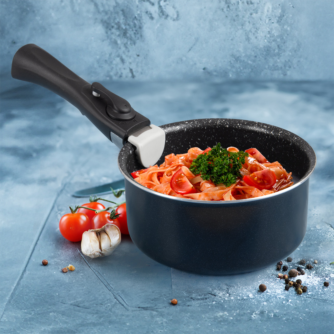 Kolekce nádobí GRANDE COMBI představuje jedinečný koncept, který vám umožňuje kombinovat různé kusy nádobí – od hrnců až po pánve – s jedinou univerzální rukojetí.