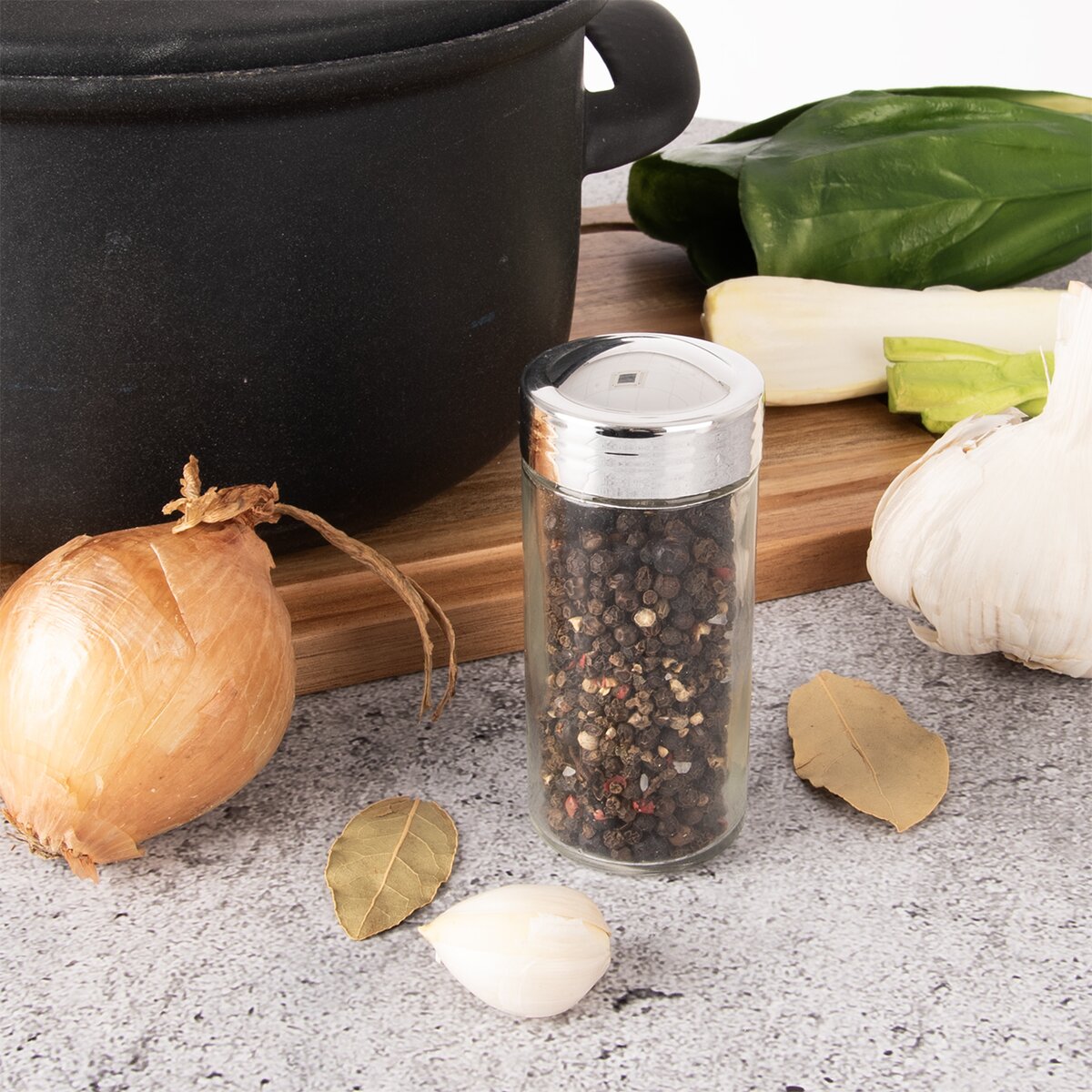 Skleněná kořenka s oblým pochromovaným uzávěrem uchová vůni koření, bylinek a různých dochucovadel a udrží je v suchu. Průhledné tělo usnadní identifikaci dochucovadla, případně ji můžete polepit popsanou samolepkou.