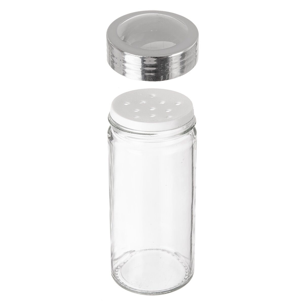 Kód produktu 153611Skleněná kořenka objemu 80 ml s pochromovaným víčkem a sypátkem k uložení koření, bylinek, dochucovadel.