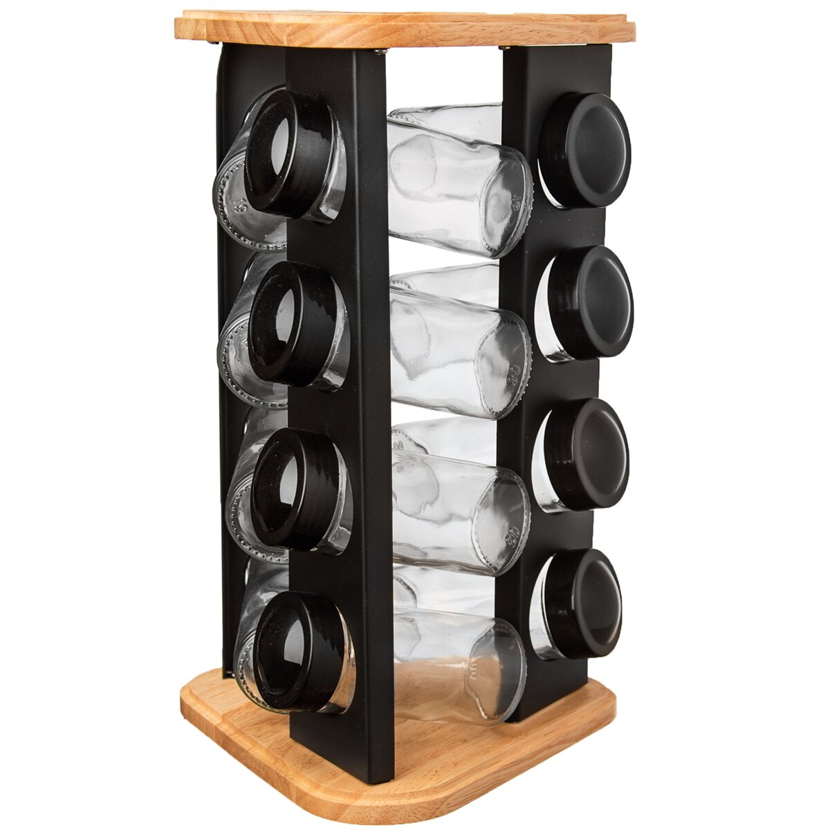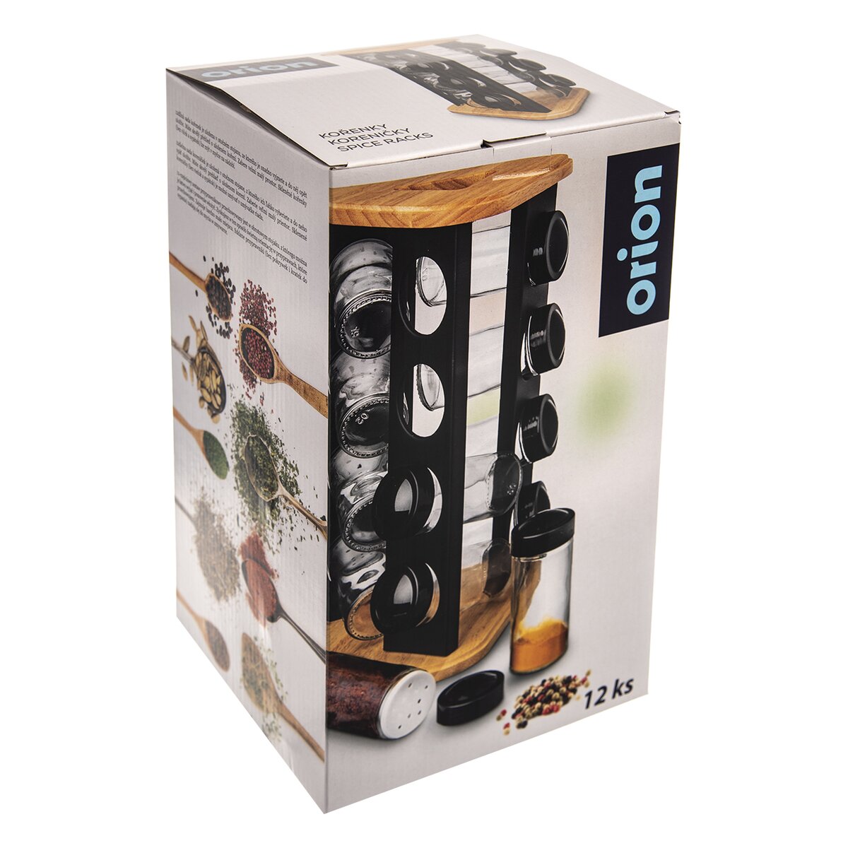 Kód produktu 155101Sada 12 skleněných kořenek s plastovými sypátky o objemu 0,08 l v otočném dřevěném stojanu pro uložení dochucovadel a koření.