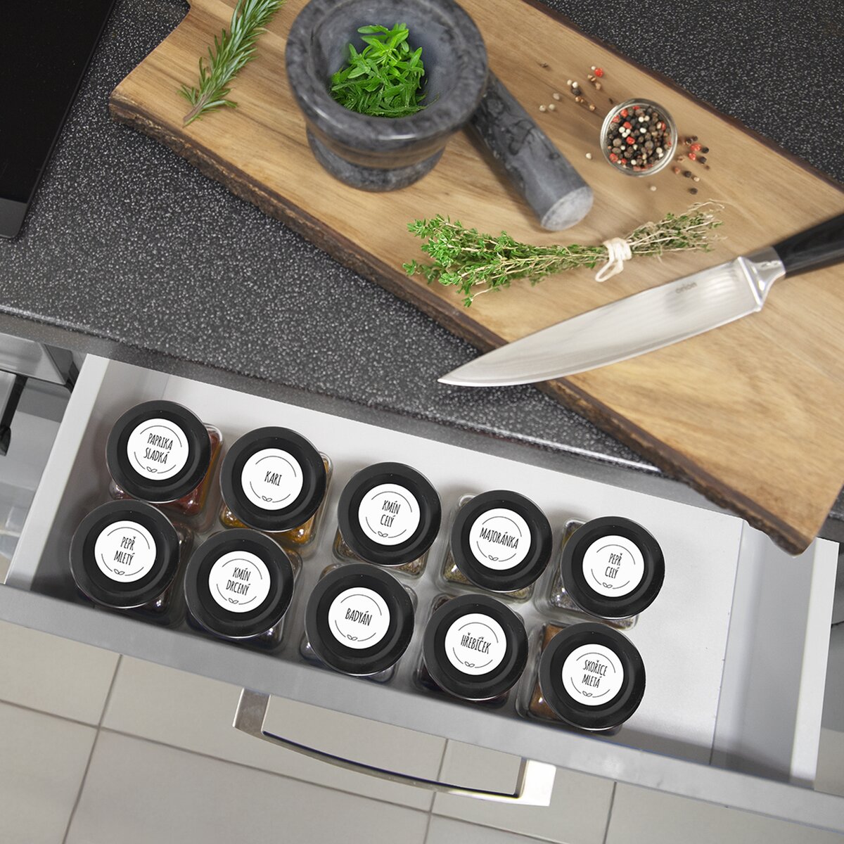K jejich označení v zásuvce nebo v polici lze použít stylové samolepky WHITELINE nebo BLACK.