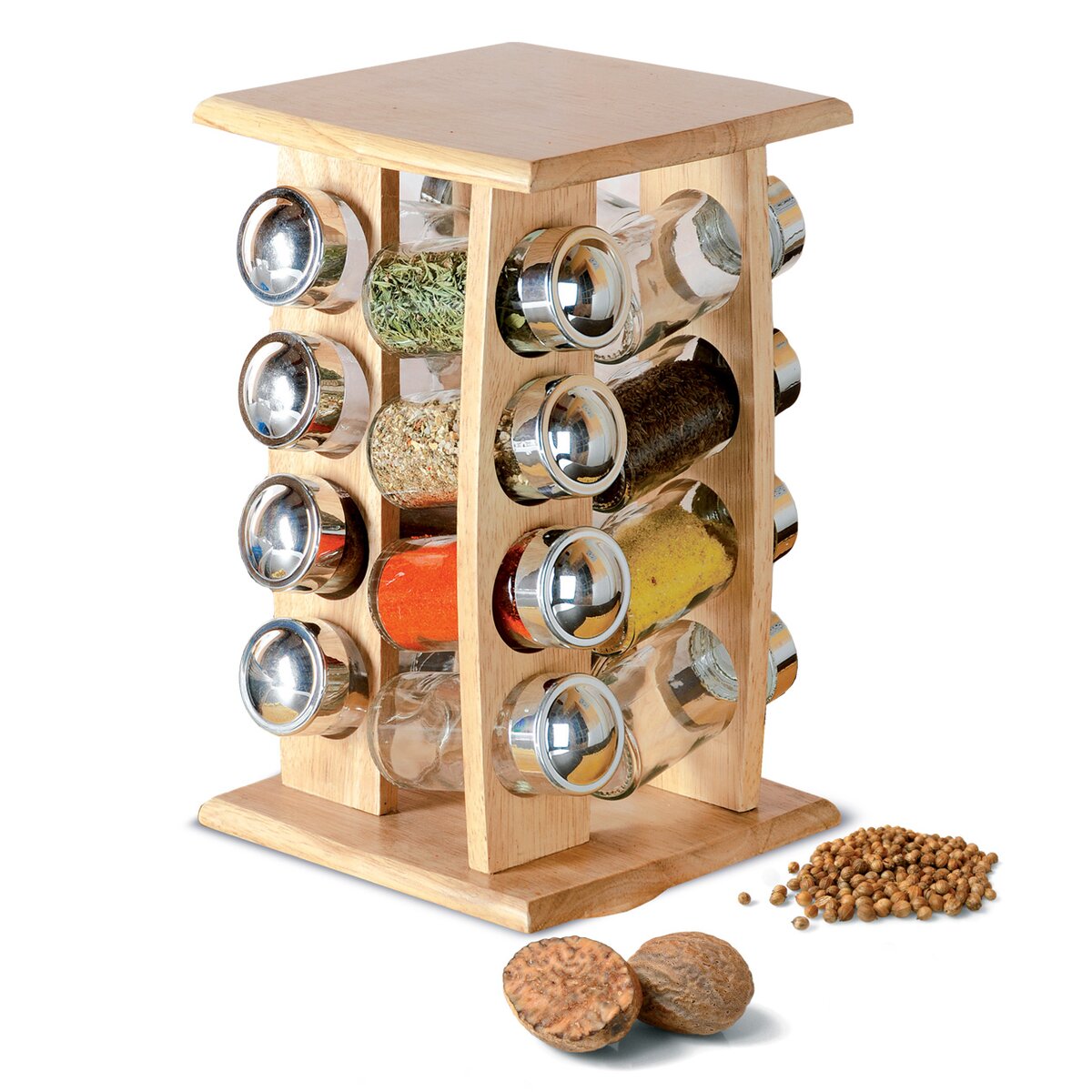 Kód produktu 123919Dřevěný otočný stojan se 16 skleněnými kořenkami pro uložení koření, bylinek a dochucovadel.