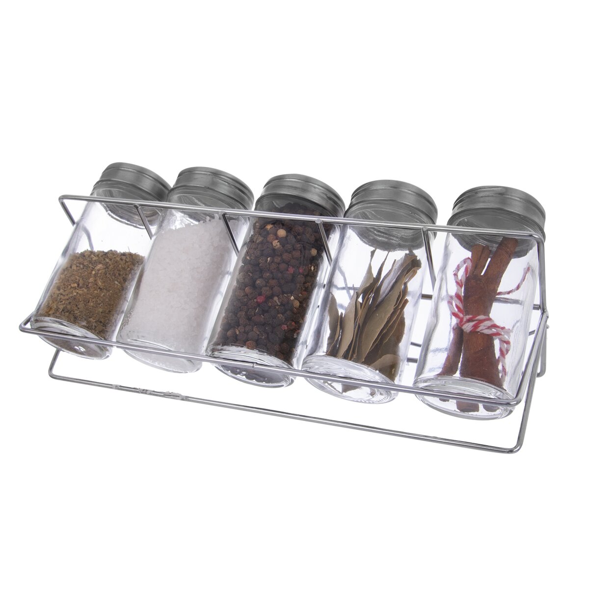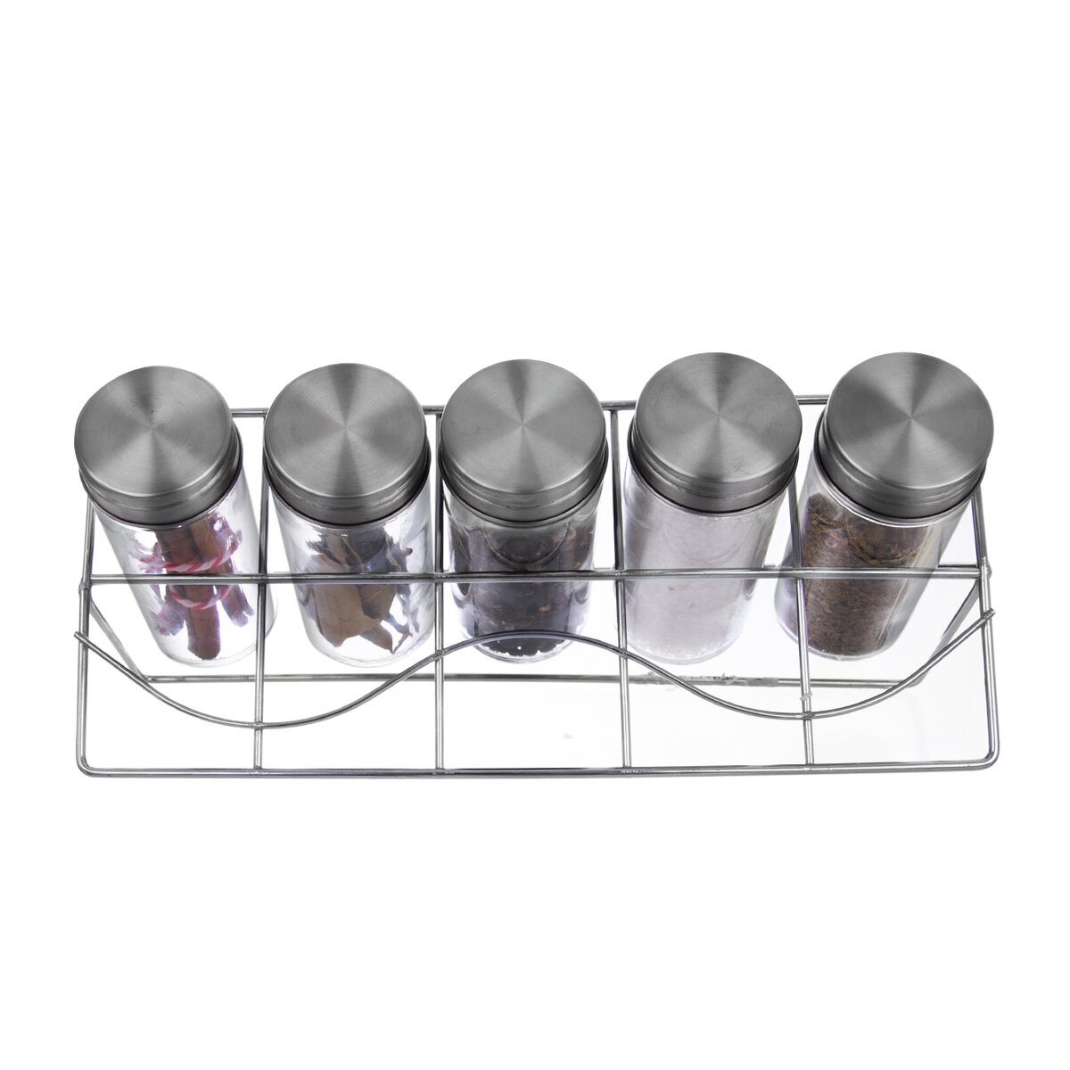 Kód produktu 153662Kovový stojan s 5 skleněnými kořenkami s nerezovým víčkem pro uložení koření, bylinek a dochucovadel.