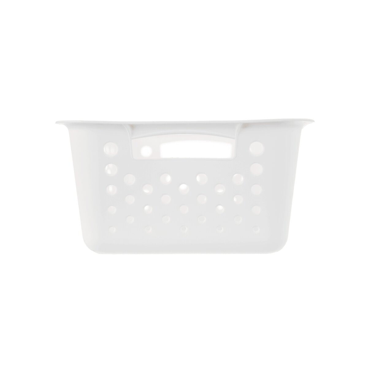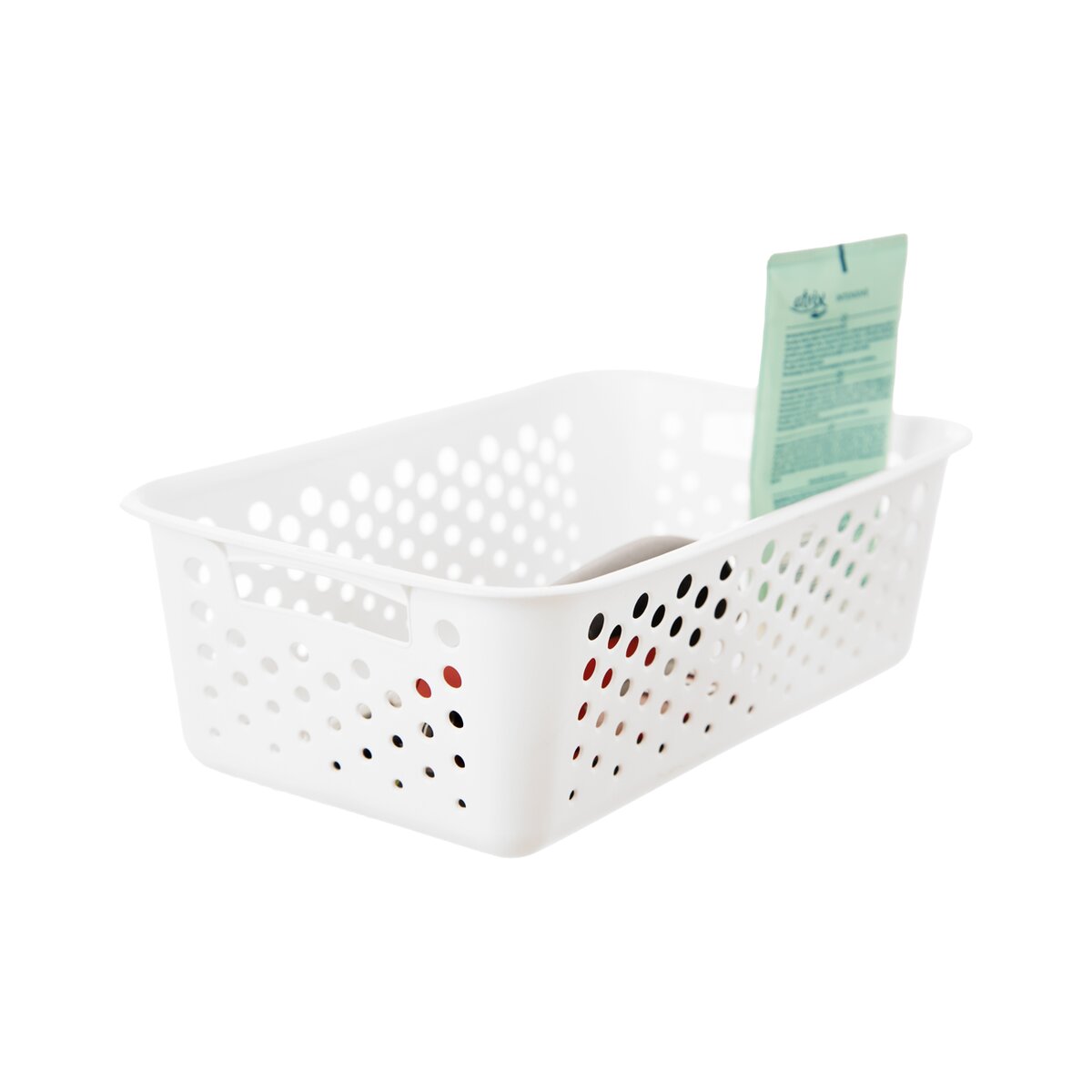 Kód produktu 731609Bílý plastový košík o rozměrech 25x16x8 cm slouží k uložení drobných předmětů v domácnosti.