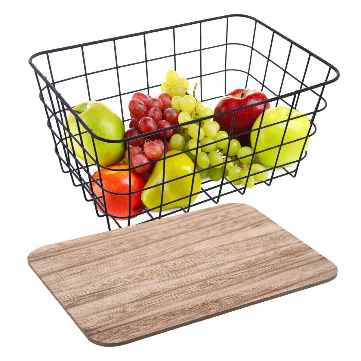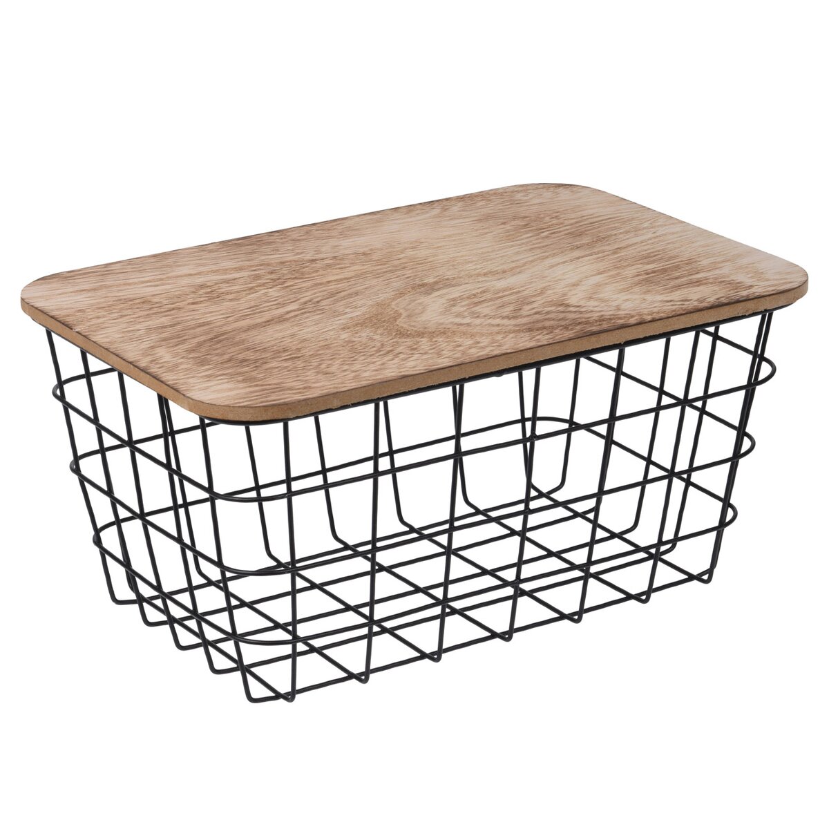 Drátěný košík s dřevěným víčkem. Materiál: kov, dřevo. Rozměry: 31,5x21,5x15,5 cm.