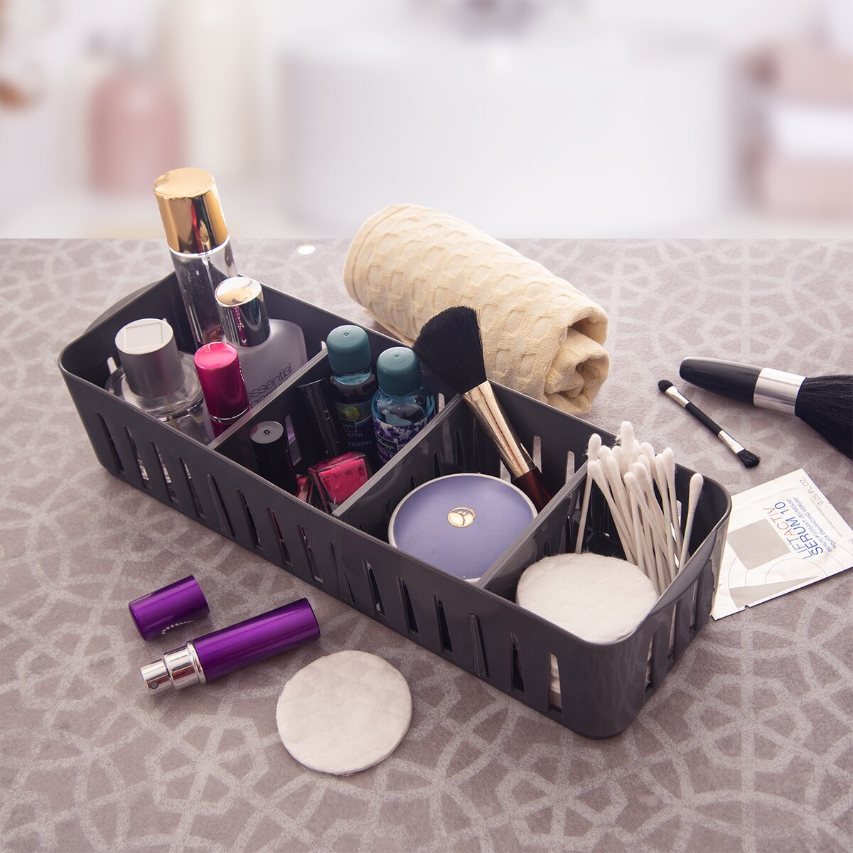 Kód produktu 731615Šedý košík velikosti 32x10x6,8 cm s nastavitelnými přepážkami je určen k ukládání drobností v kuchyni, koupelně, pokoji i dílně. Tři přepážky lze snadno vyjmout a přizpůsobit členění košíku podle potřeby.