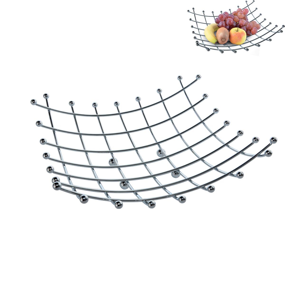 Košík na ovoce v moderním provedení se hodí do každé kuchyně. Materiál: pochromovaný drát. Rozměry: 28x28x9 cm.