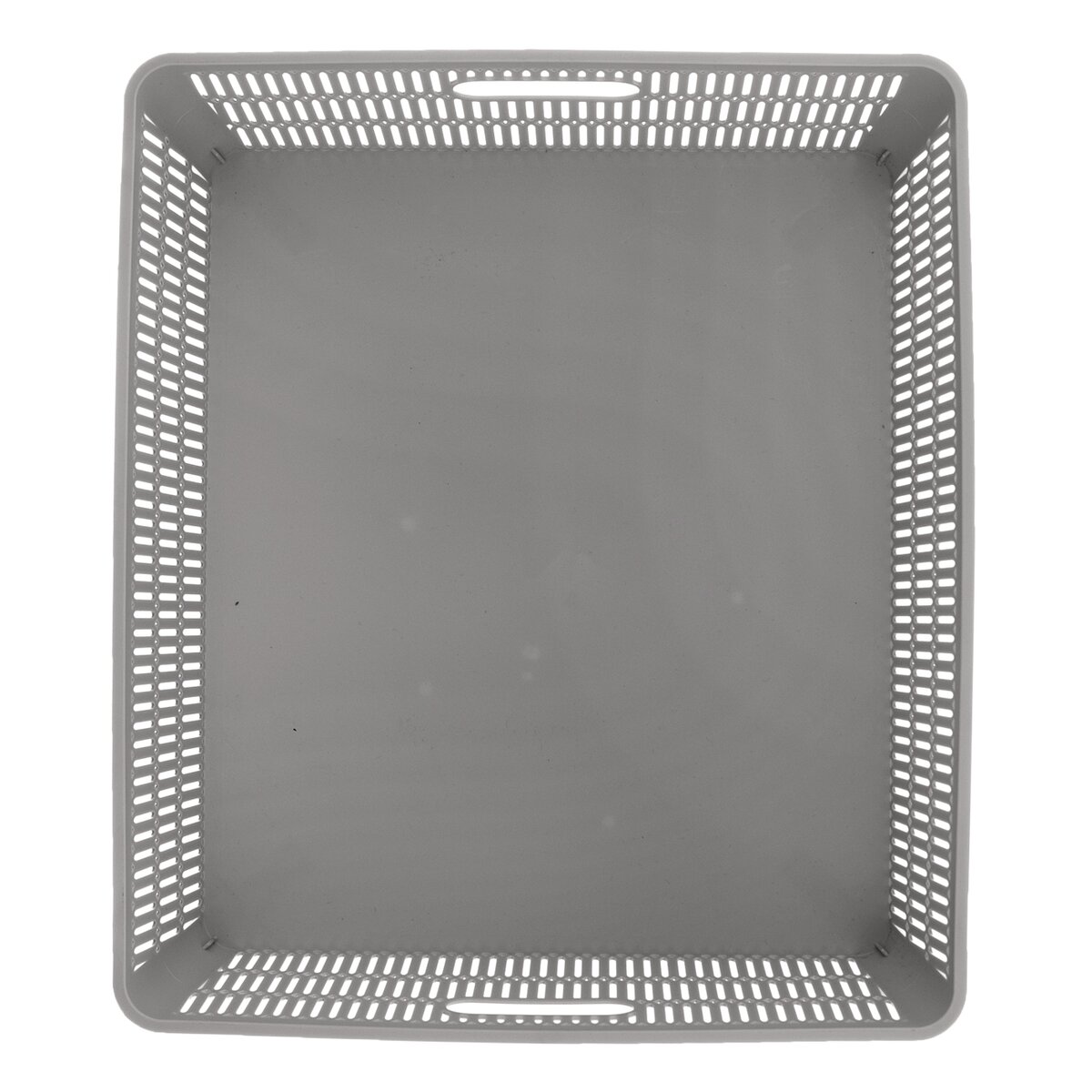 Větší šedý košík NESTA má navíc vychytávku v podobě vysunovacích klapek v dolní části, z rohů lze klapky vysunout a uložit tak několik košíků na sebe. Je vyroben z kvalitního plastu PP.