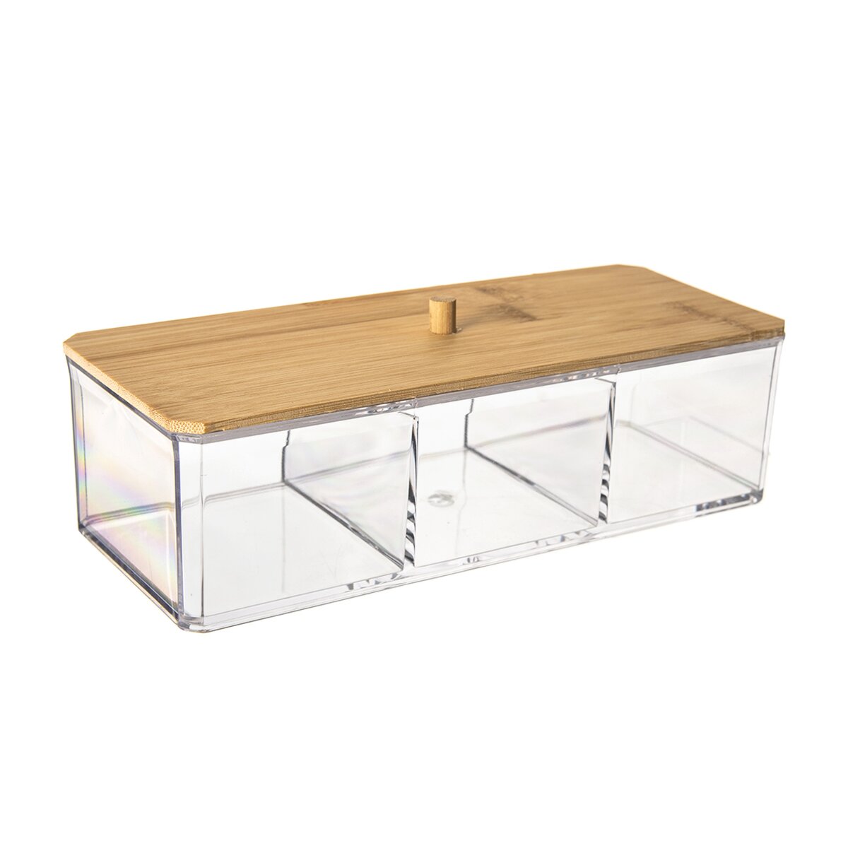 Kód produktu 811253Podélná plastová transparentní dóza WHITNEY na drobnou kosmetiku, šperky i čajové sáčky, uzavřená bambusovým víčkem. Má tři přihrádky pro lepší organizaci ukládaných drobností.