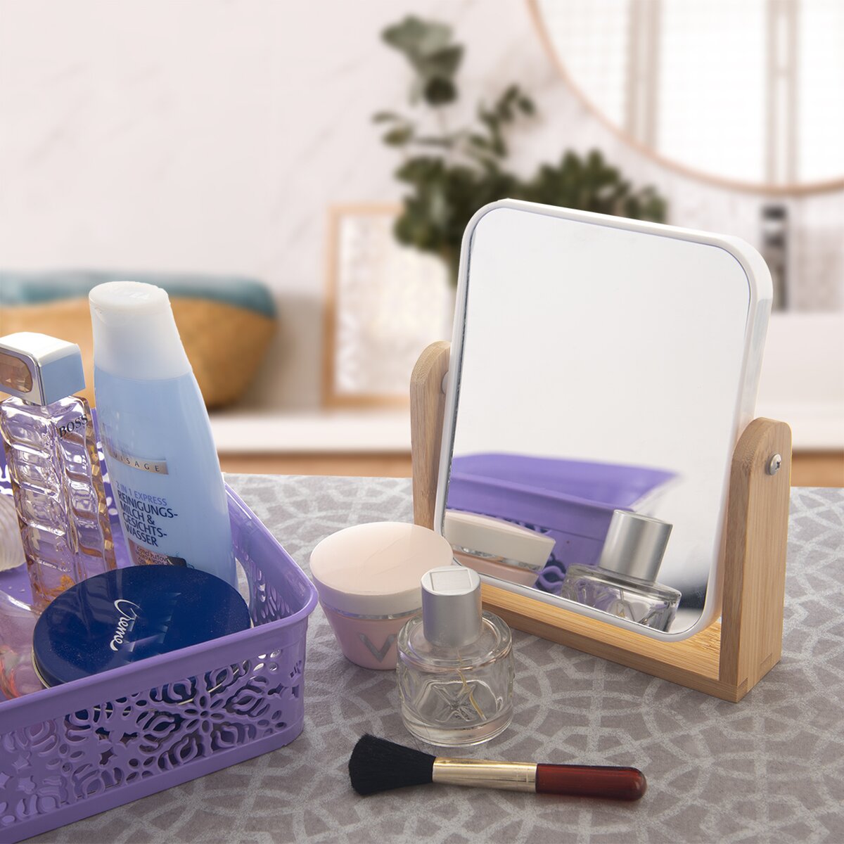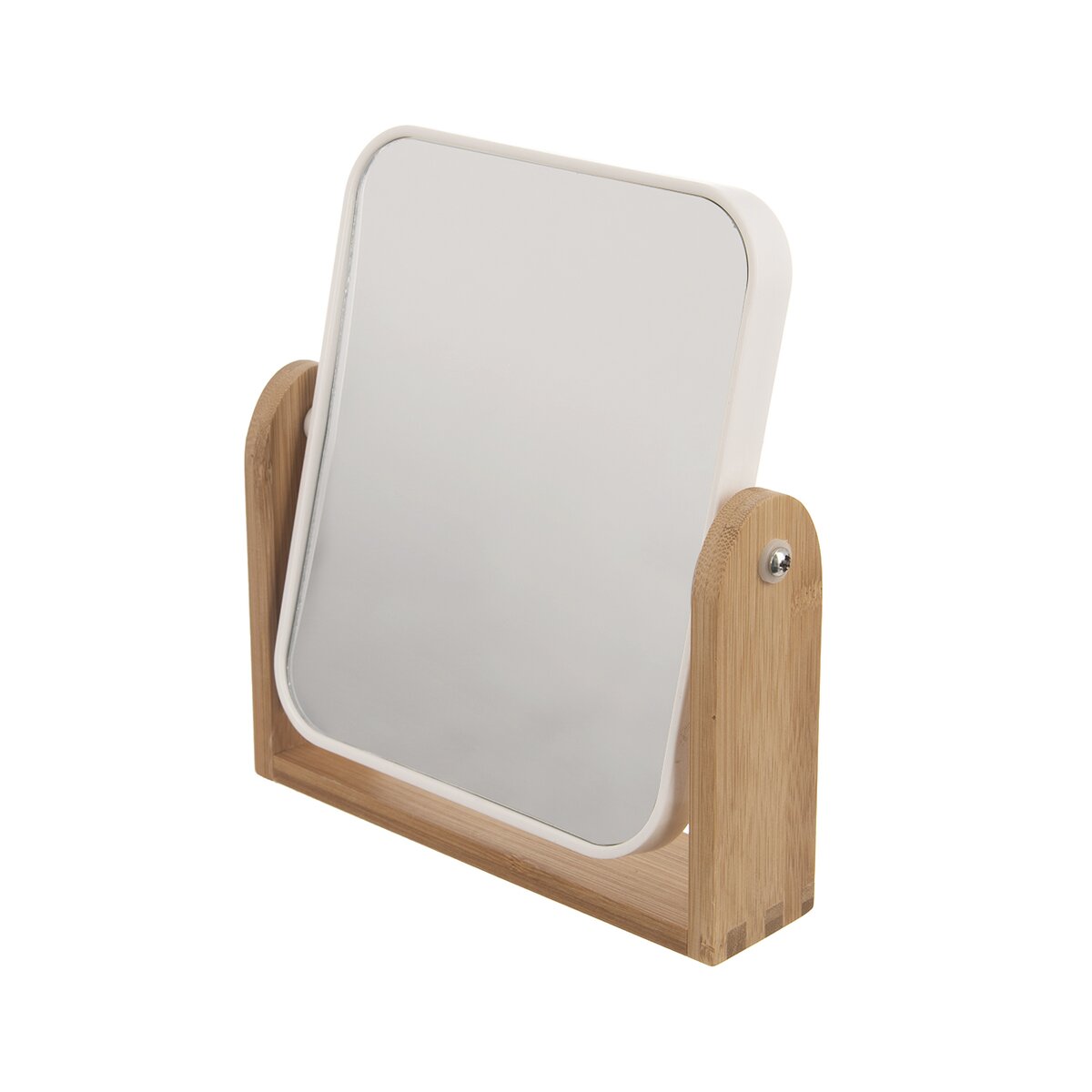 Upravený obličej a přiměřený make-up je vizitkou každé ženy. Aby bylo líčení očí, úprava obočí stejnoměrné, přesně podle vašich představ, umožní šikovné stolní zrcadlo z plastu PS a skla, uložené na kovových šroubech v elegantním bambusovém stojanu.