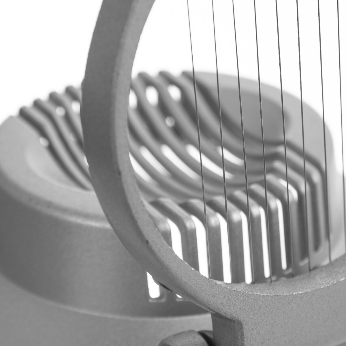 Stačí jen zvednout horní část s vodorovně nataženými strunami, oloupané vajíčko položit do prohlubně a zatlačit.