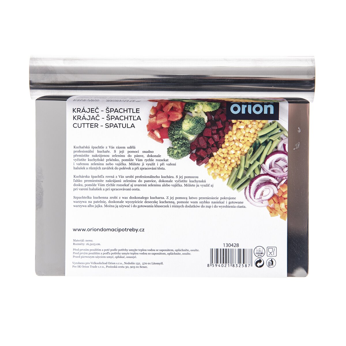 Kód produktu 130428Kuchařská nerezová špachtle, vhodná ke krájení vařené zeleniny, zavářek, bramborových špalíčků, přenášení zeleniny z prkénka do hrnce nebo mísy. Pomůže i s čištěním pracovní plochy od zbytků těsta.
