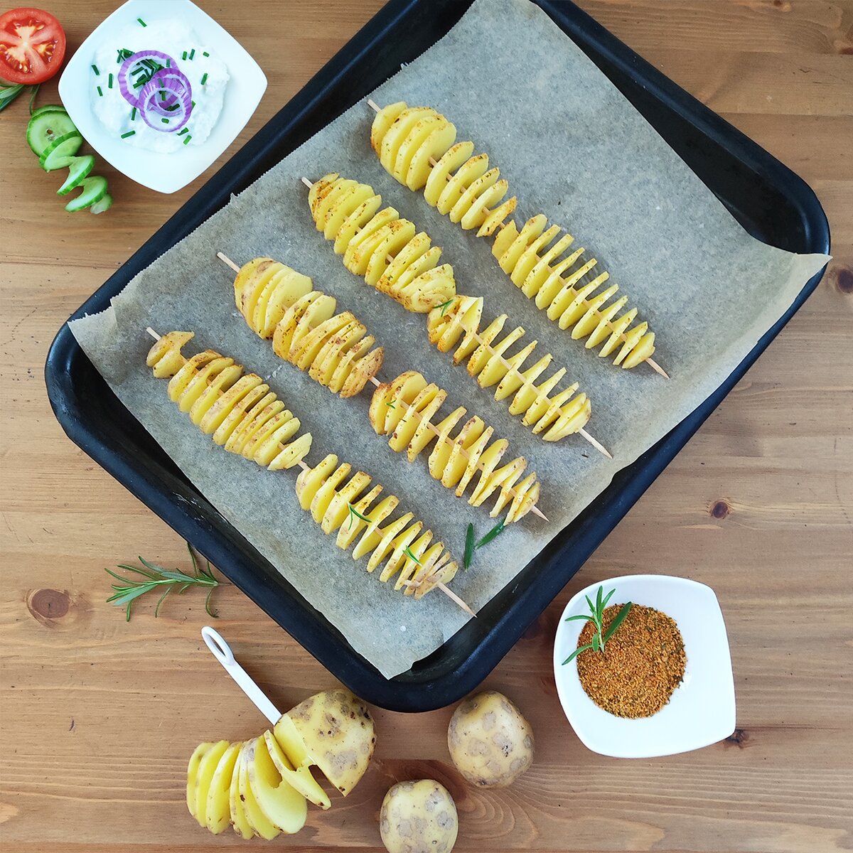 Jak na to: Špičku okurky odříznete a držíte ve svislé poloze. Hrot se závitem natáčíte do středu okurky, prst vložíte do očka a krouživými pohyby připravíte spirálu. Lze také využít na smažené spirály z brambor. Do středu brambory vtlačte vodící jehlu, nasaďte spirálový kráječ na vodící jehlu a zašroubujte pár závitů do brambory až k plastovému noži. Vložte prst do očka kráječe a otáčejte kolem osy. Do hotové spirály nasaďte špejli a usmažte. Pomocí vodící jehly připravíte i dlouhé spirály z okurky. Na spirály z mrkve nebo petržele vyberte mrkev/petržel silnější, vložte do mikrovlnného sáčku a na 2 minuty dejte do MVT na střední teplotu (zelenina mírně změkne). Vykrájejte do spirály jako okurku.