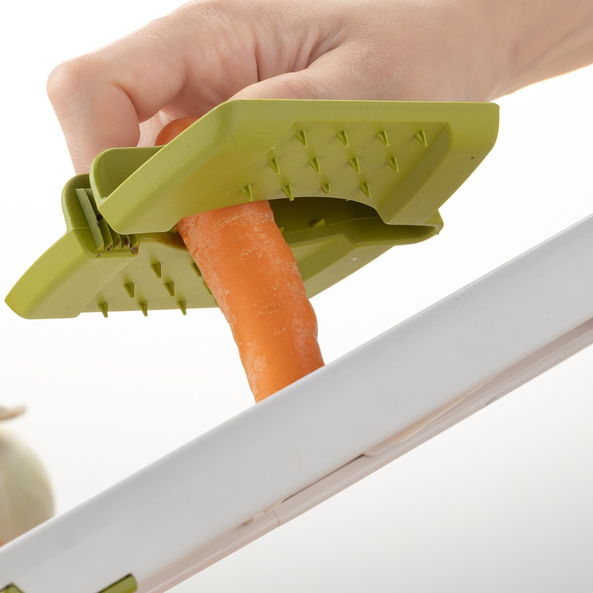 Kráječ je vybaven zeleným držákem proti poranění. Obsahuje speciální hroty, které zajišťují pevné uchycení potravin buď jejich nabodnutím nebo sevřením ve střední části. Umožňuje tudíž bezpečnou manipulaci při krájení brambor, kousku cukety, jablka, cibule, mrkve, okurků i malých surovin, například česneku. Pro větší stabilitu při použití obsahuje kráječ dva protiskluzové rohy z plastu EVA, které zabraňují nežádoucímu posunu kráječe. Kráječ je vyroben z plastu ABS a máostří z nerezové oceli 301, držák z plastu PP.