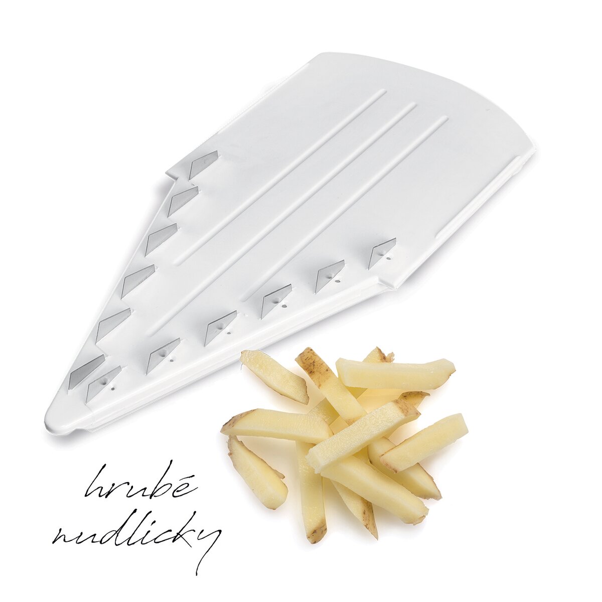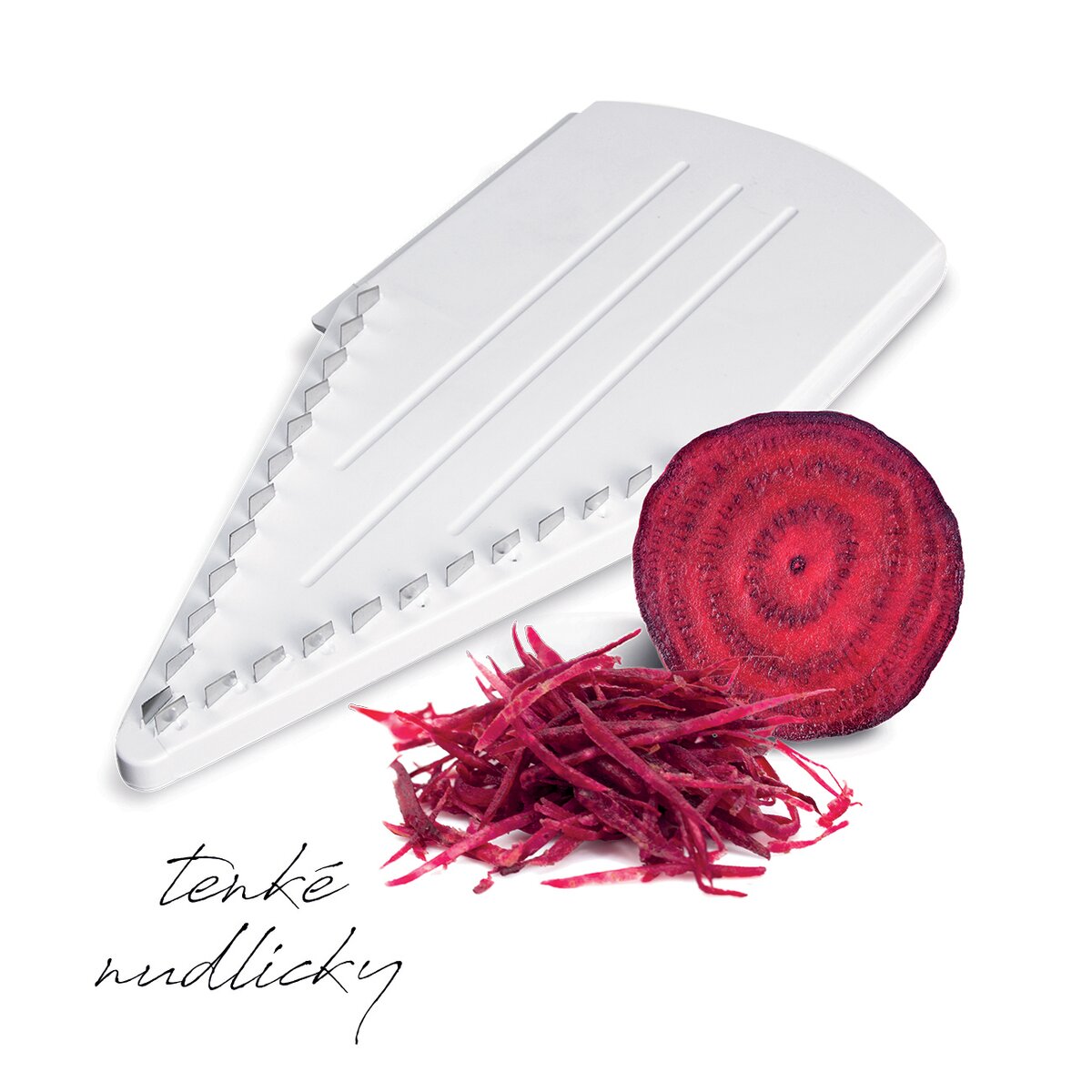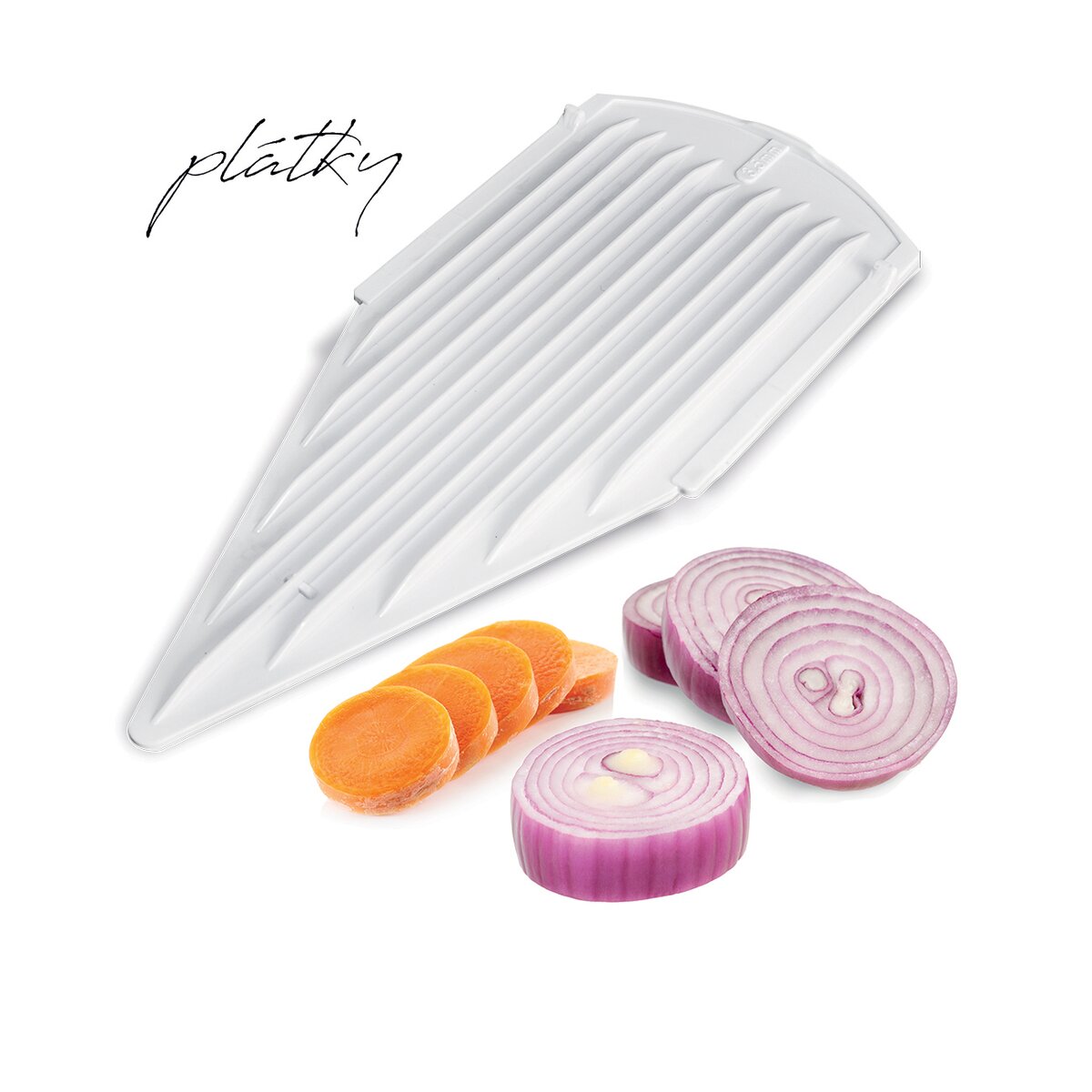 Je opatřeno výměnnými struhadly, které umožňují plátkování, strouhání úzkých i širších kusů zeleniny - např. oblíbených hranolků. Výměnné části jsou opatřené ostrými nerezovými břity. Součástí je vodící rukojeť pro ochranu prstů, pomocí které potravinu, např. cibuli, krájíte, aniž byste se zranili.
