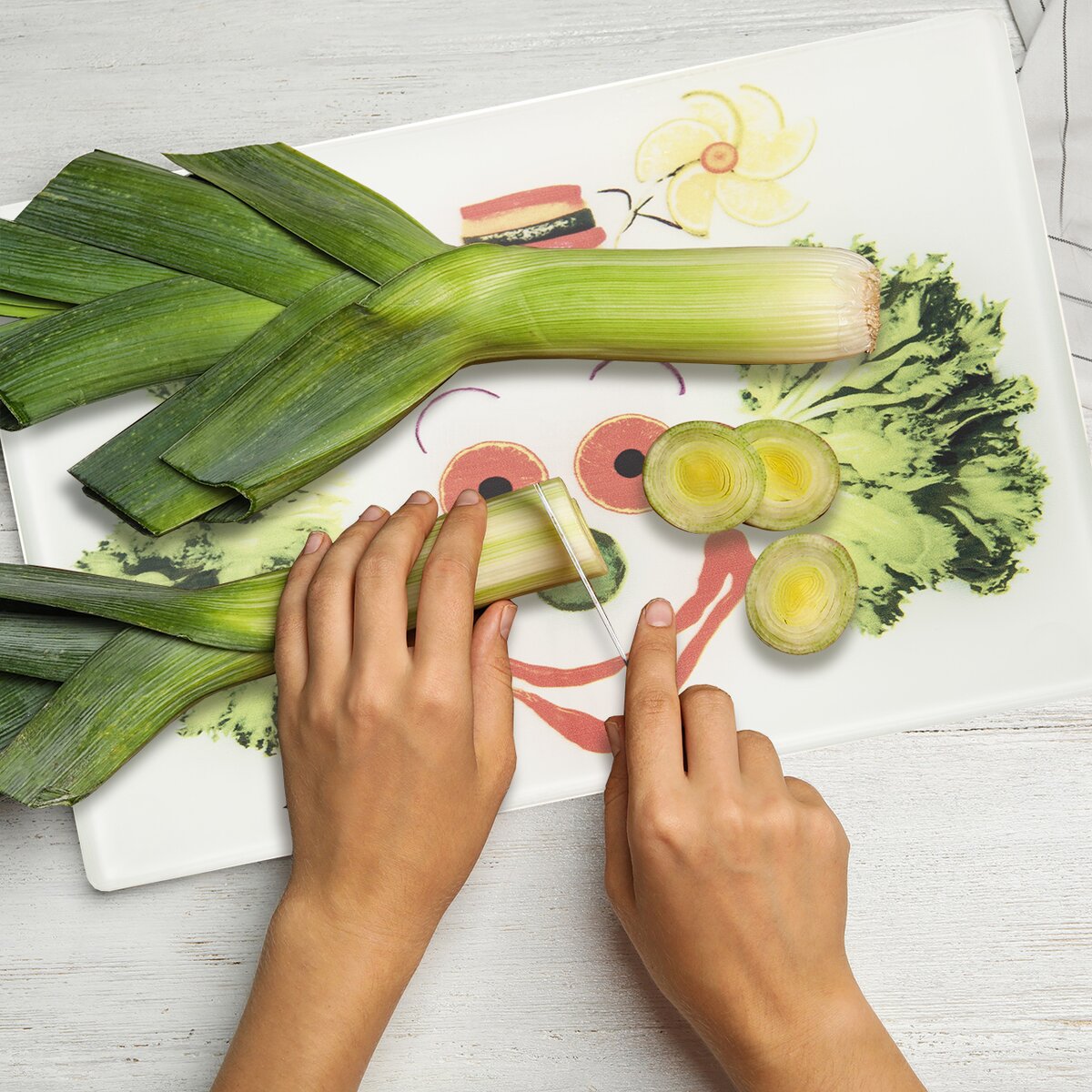 Více informacíVeselá krájecí podložka z tvrzeného skla v kuchyni slouží nejen na krájení potravin. Můžete ji skvěle využít také jako kryt části varné desky, tím získáte větší pracovní plochu v malých kuchyních, nebo ji umístit při vaření za varnou desku a zabránit tak ušpinění stěny.