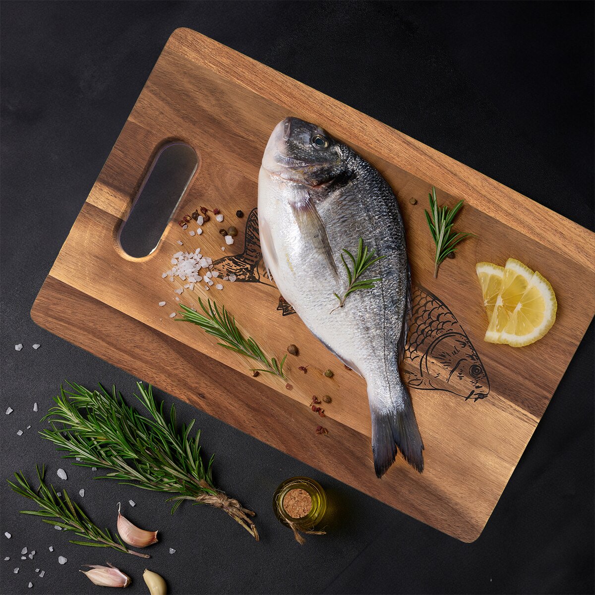Kód produktu 126851Dřevěné prkénko z akácie o rozměrech 36×24 cm je doplněno motivem ryby. Hodí se na krájení různých druhů ryb a mořských plodů, případně k jejich servírování z grilu.