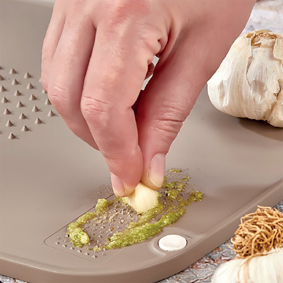 Kód produktu 121425Hnědé plastové prkénko s mírným sklonem pro krájení nejrůznějších potravin. Je oboustranné, z jedné straně univerzální hladká plocha, z druhé má uprostřed výstupky, které udrží potraviny na jednom místě, drobné hroty zase pomohou s třením česneku. Má protiskluzové podložky.