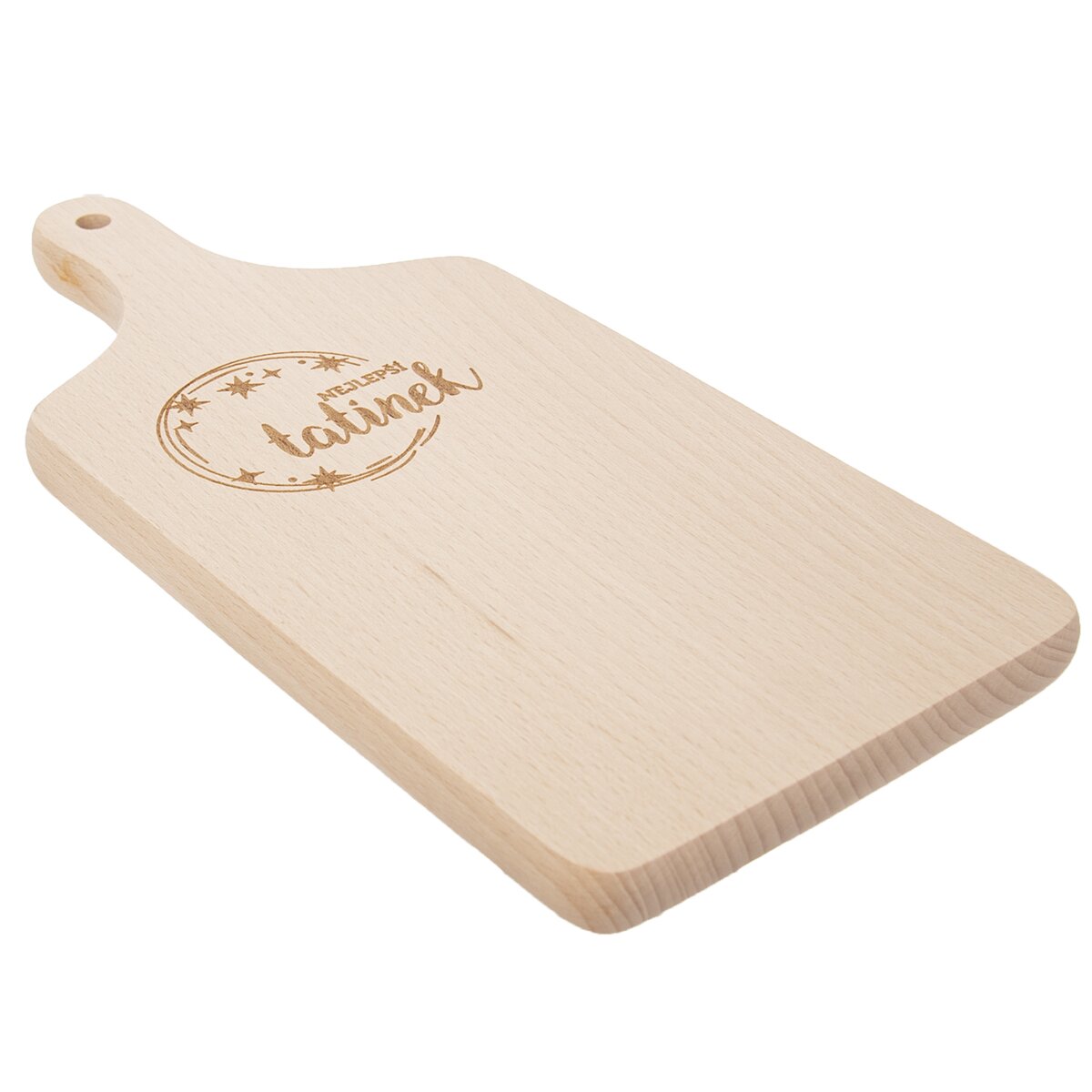 Kód produktu 126830Dřevěné krájecí prkénko o rozměru 30×14 cm s praktickou rukojetí a vypalovaným dekorem NEJLEPŠÍ TATÍNEK.