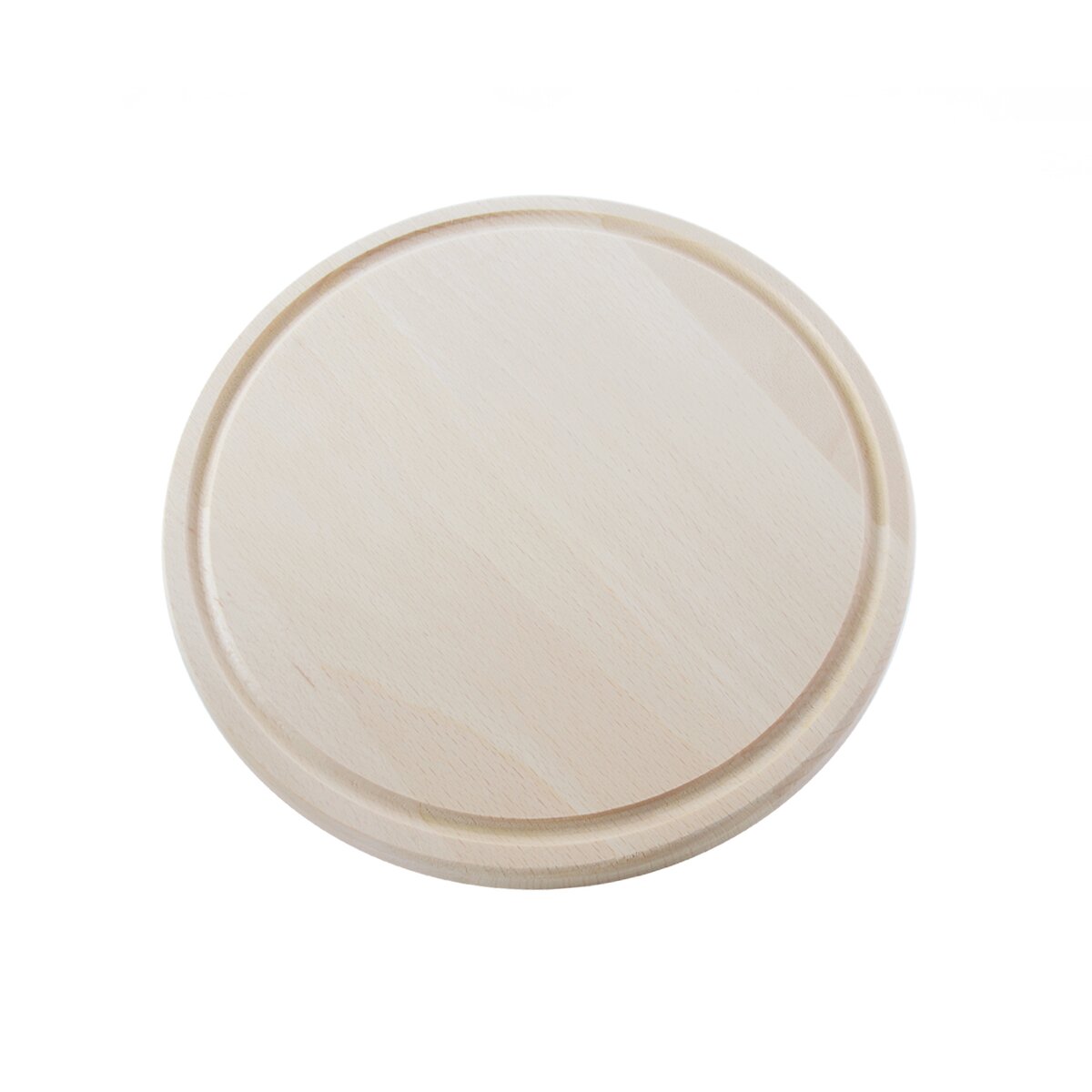 Kód produktu 142558Kulaté dřevěné prkénko o průměru 25 cm opatřené drážkou po obvodu krájecí plochy.