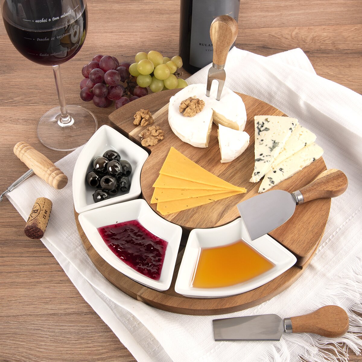 Obsahuje nůž mandlového tvaru, nůž s rovným ostřím a praktickou vidličku se dvěma hroty k napichování sýrů, všechny doplněné o akáciovou rukejeť. Užijte si posezení s partnerem nebo přáteli při malé ochutnávce sýrů a v bílých keramických miskách servírujte různé dipy, pomazánky, olivy, sušená rajčata, kapary nebo drobné krekry, ořechy a mandle.