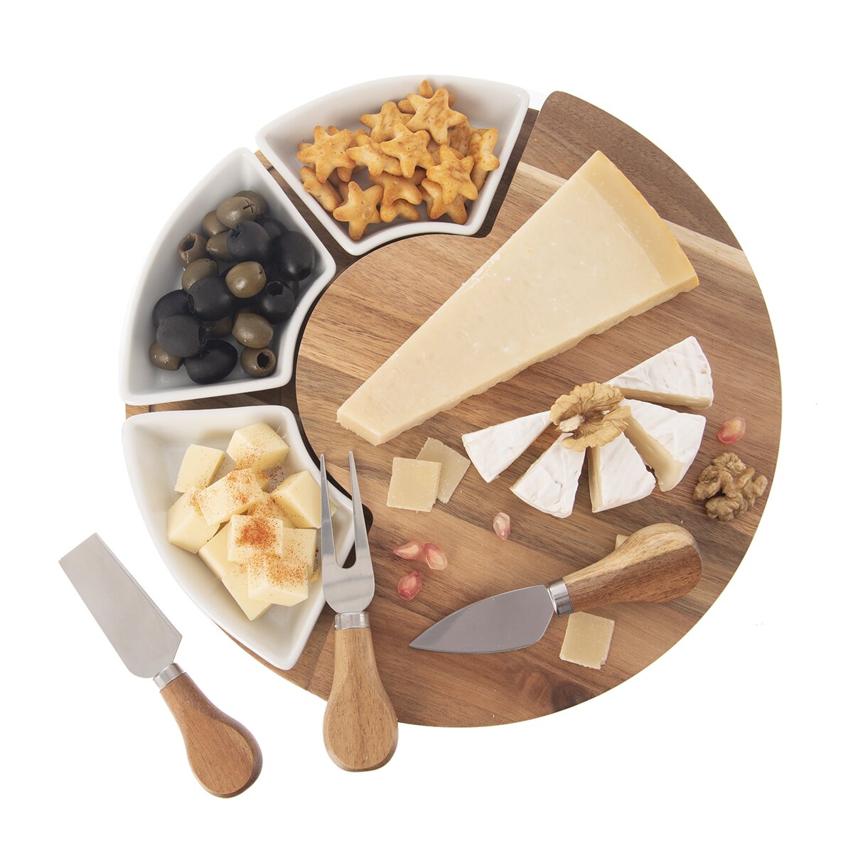 Kód produktu 126843Sada krájecího akáciového prkénka o průměru 28 cm ukrývá 3 kráječe na sýr o délce 13 cm a je doplněna 3 keramickými miskami na oříšky, olivy, dipy nebo různé drobné krekry.