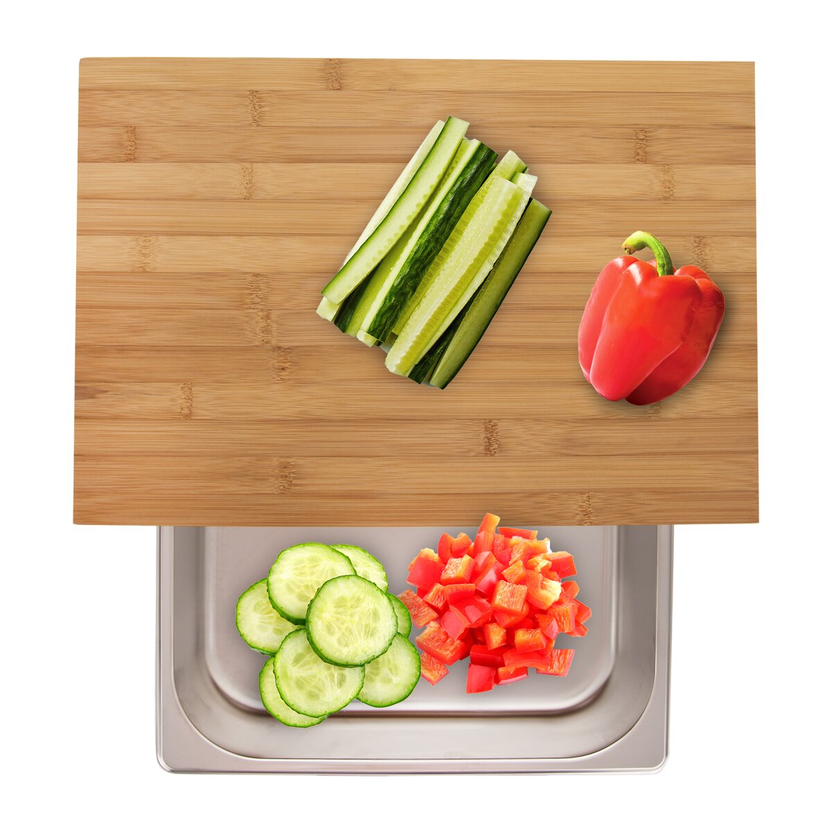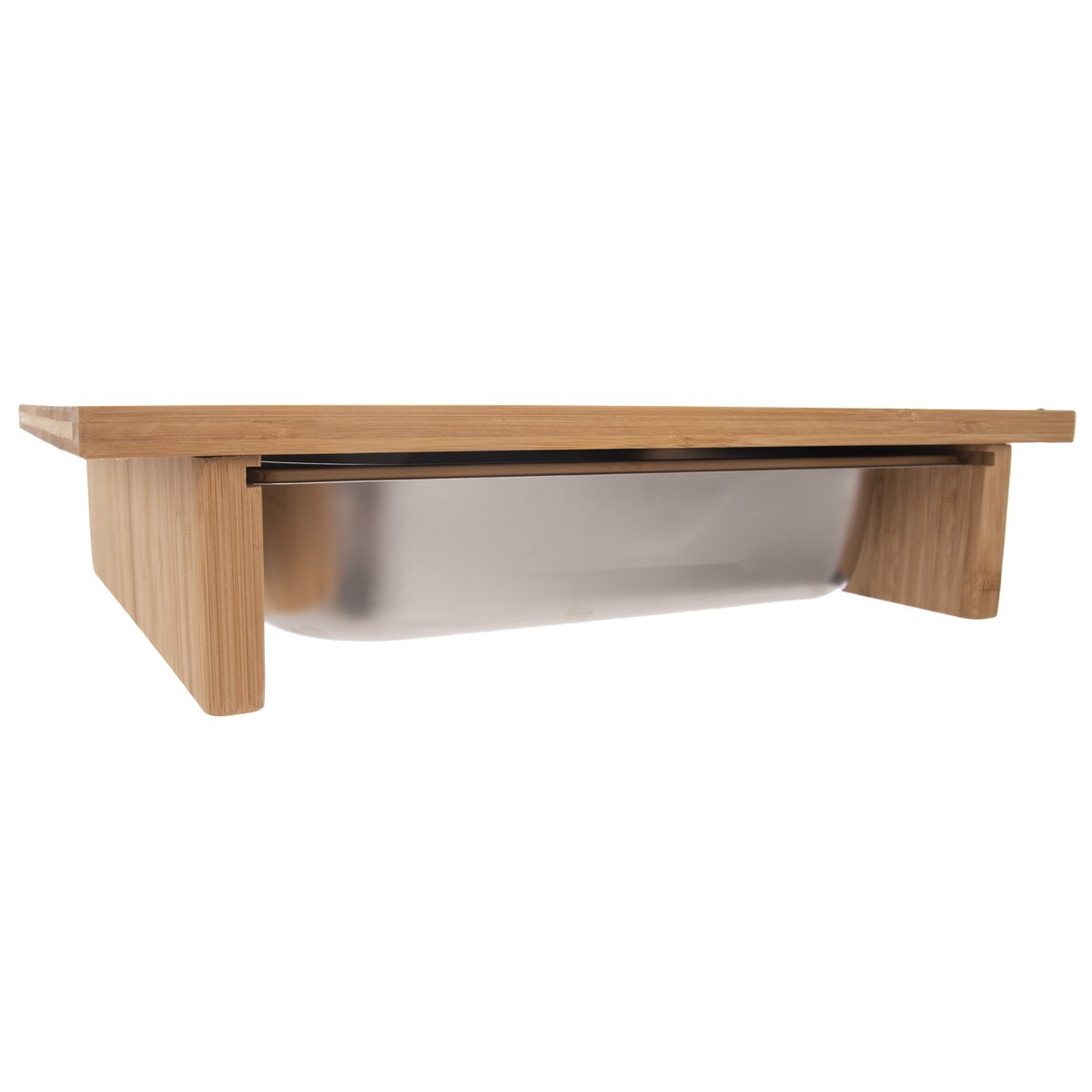 Kód produktu 126808Bambusové krájecí prkénko o rozměru 42×29×8,5 cm s nerezovým zásobníkem o rozměru 32,5×26,5×6 cm.