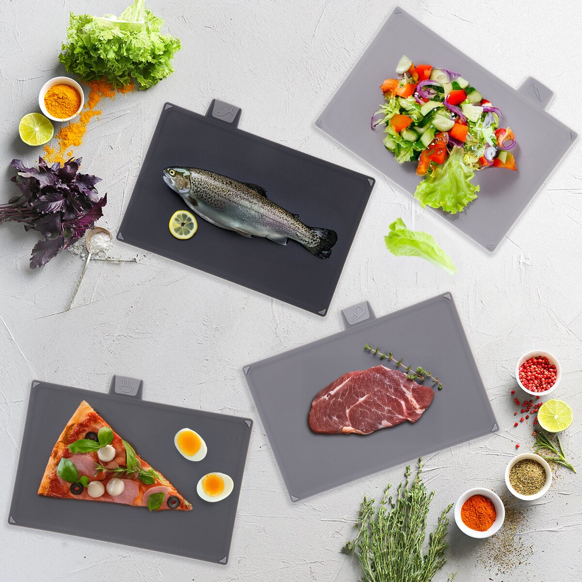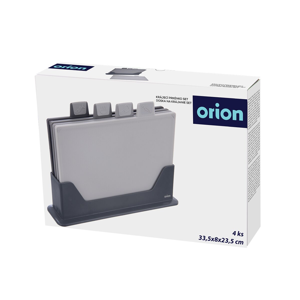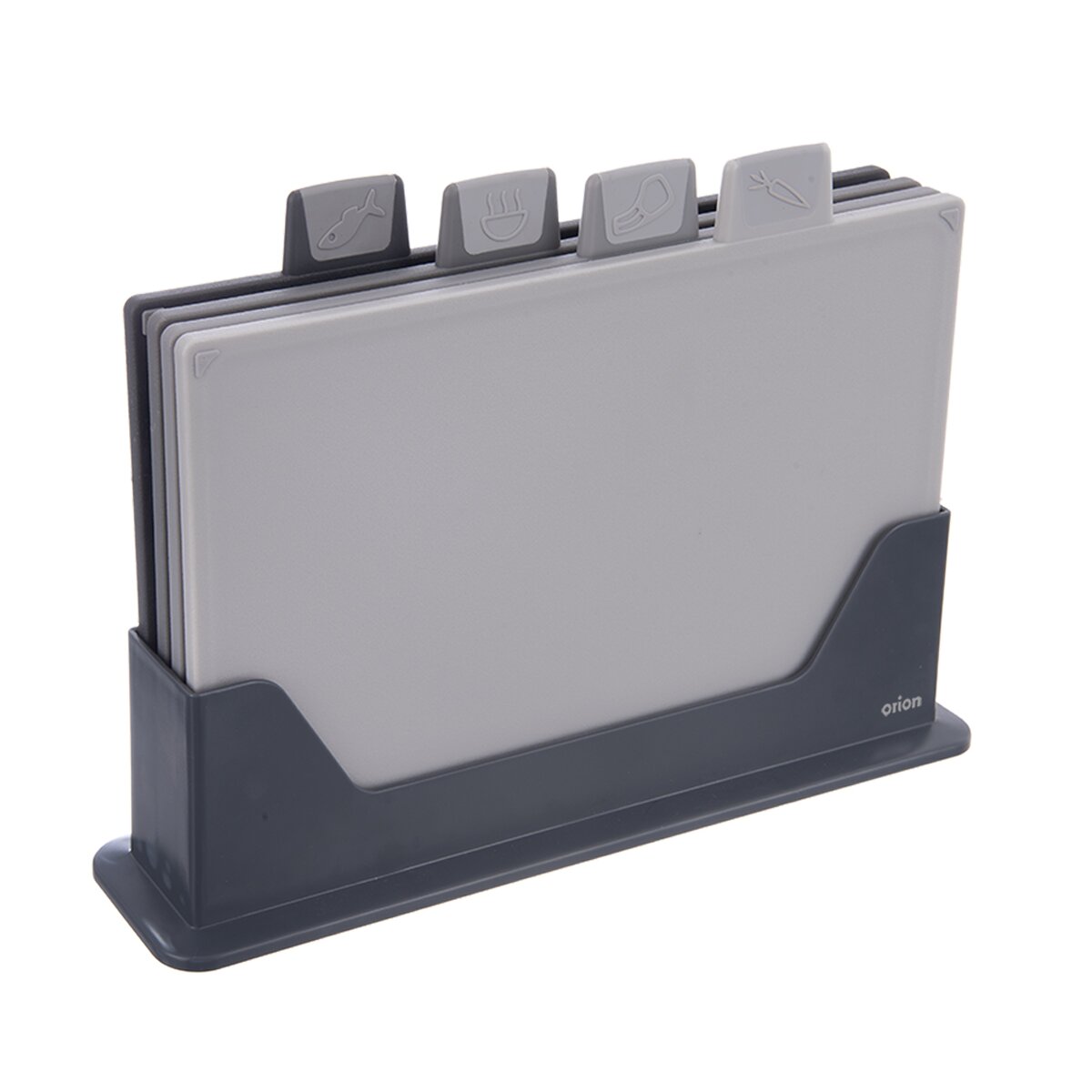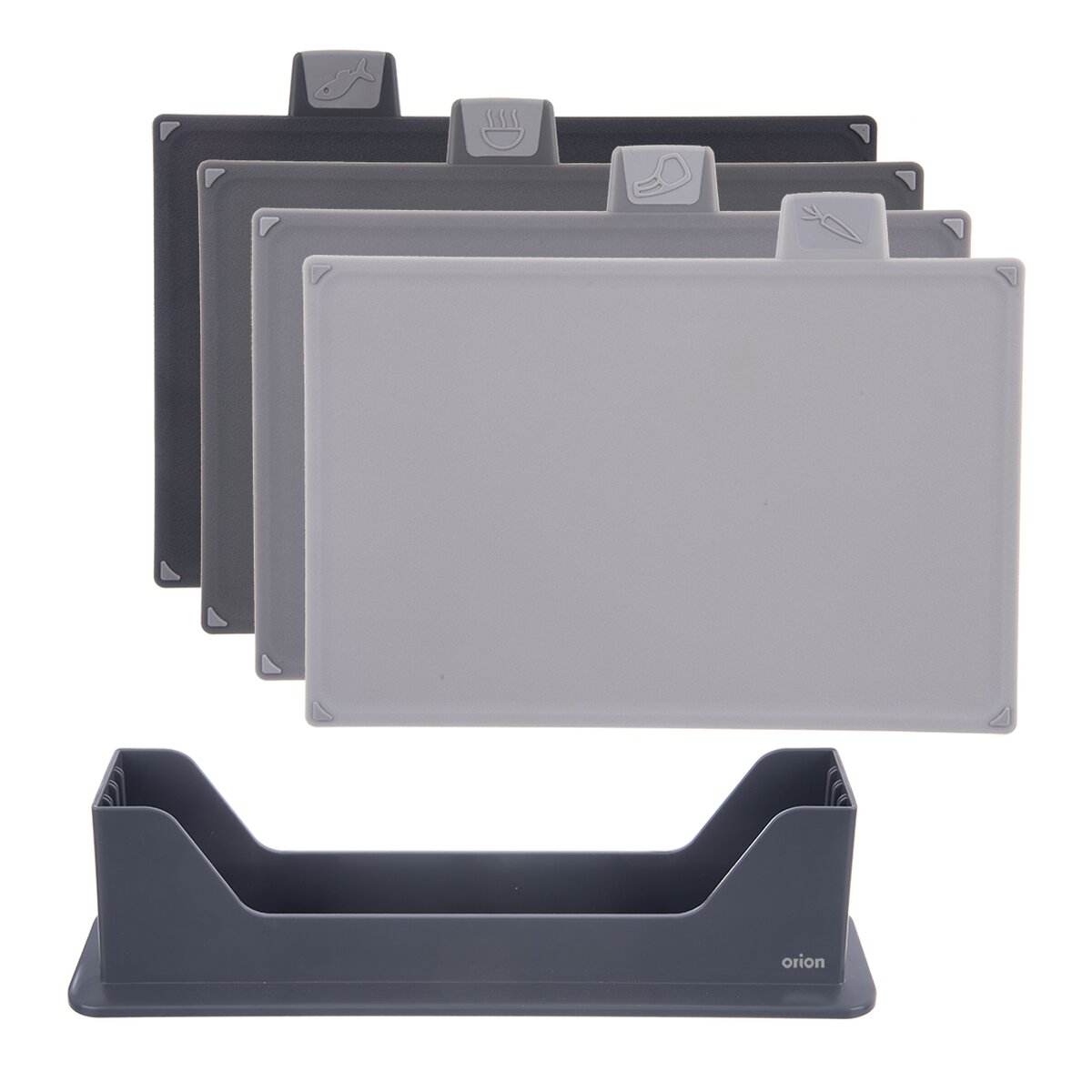 Kód produktu 126852Sada 4 plastových prkének v různých odstínech šedé barvy je uložena ve stojanu. Jsou opatřena protiskluzovými podložkami a štítkem s označením druhu potravin, což je výhodné zvláště při krájení syrového masa. Lze je používat oboustranně.