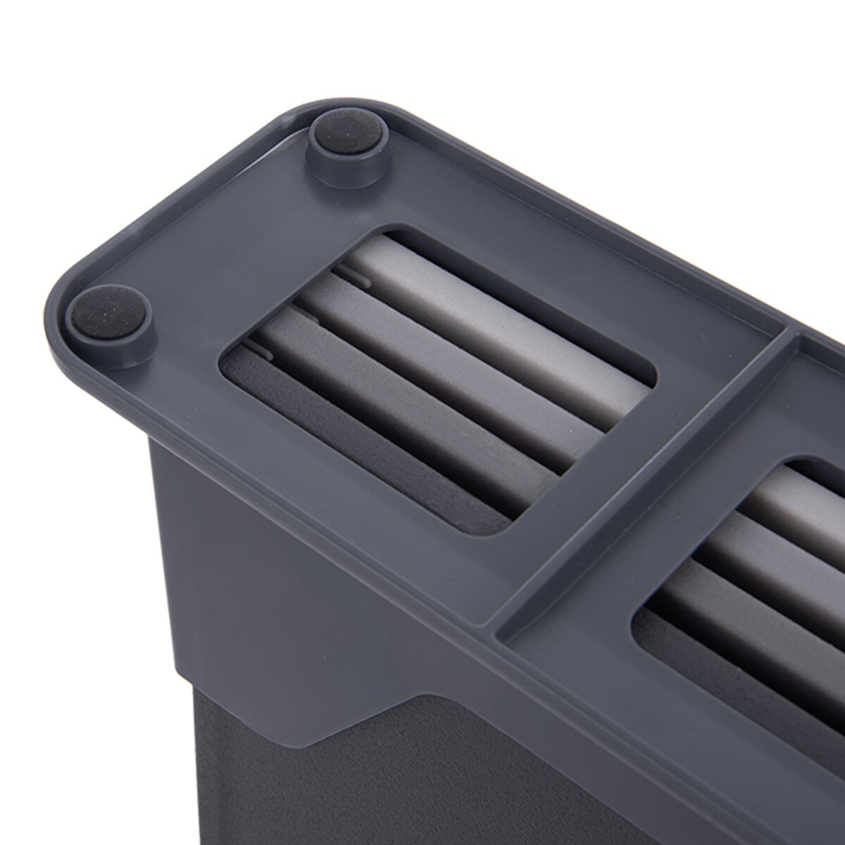 Oboustranné krájecí prkénko je tvarované tak, aby z něj šťávy z krájených potravin nestékaly. Protiskluzové podložky ho udrží pevně na místě a prkénko je jimi opatřeno z obou stran. Stojan je opatřen pěnovými podložkami, takže se po podložce nesmeká a nepoškodí ji.