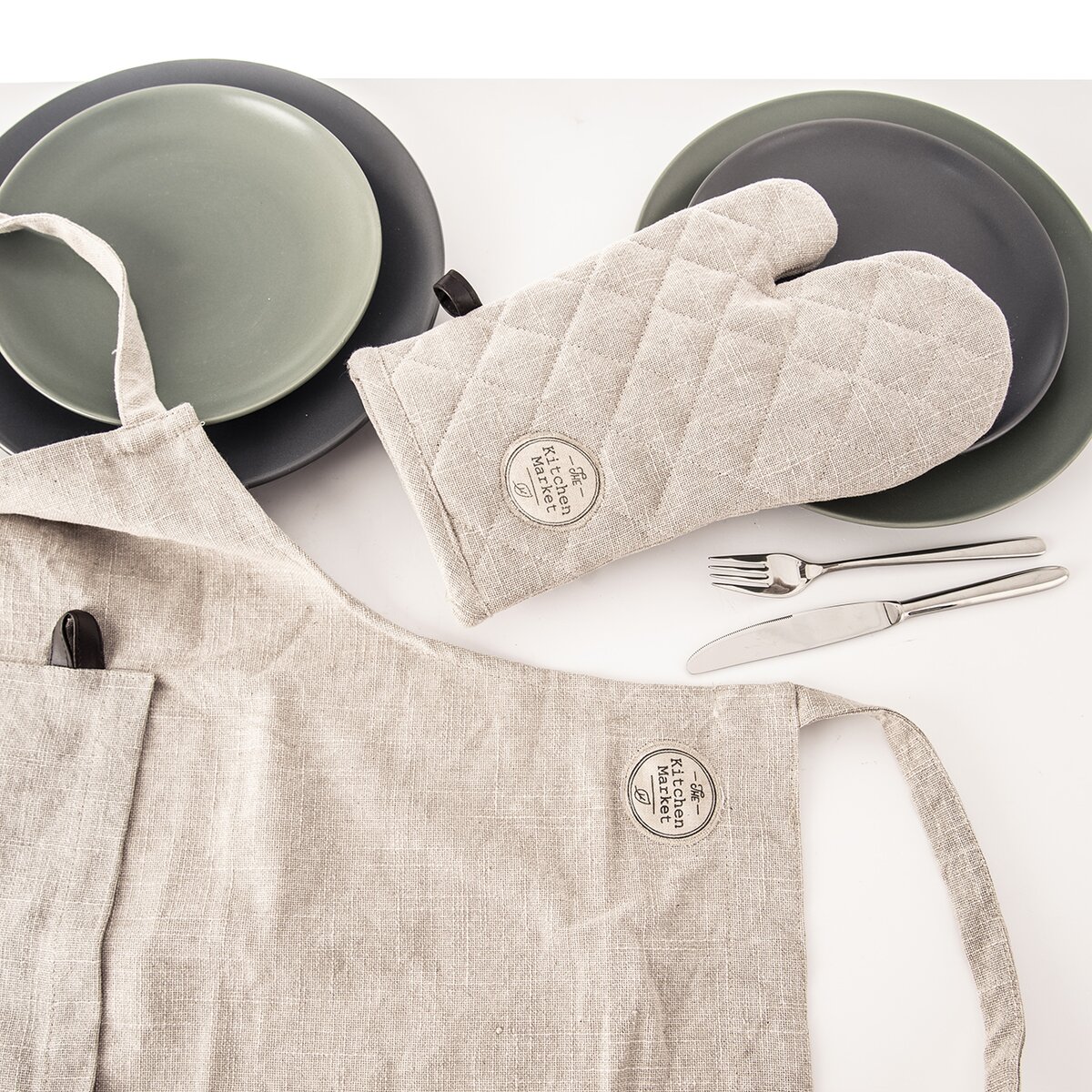 Kód produktu 153906Bavlněná kuchyňská rukavice v béžové barvě, s poutkem pro zavěšení a v délce 31 cm. Zajímavý všitý detail s nápisem The Kitchen Market.