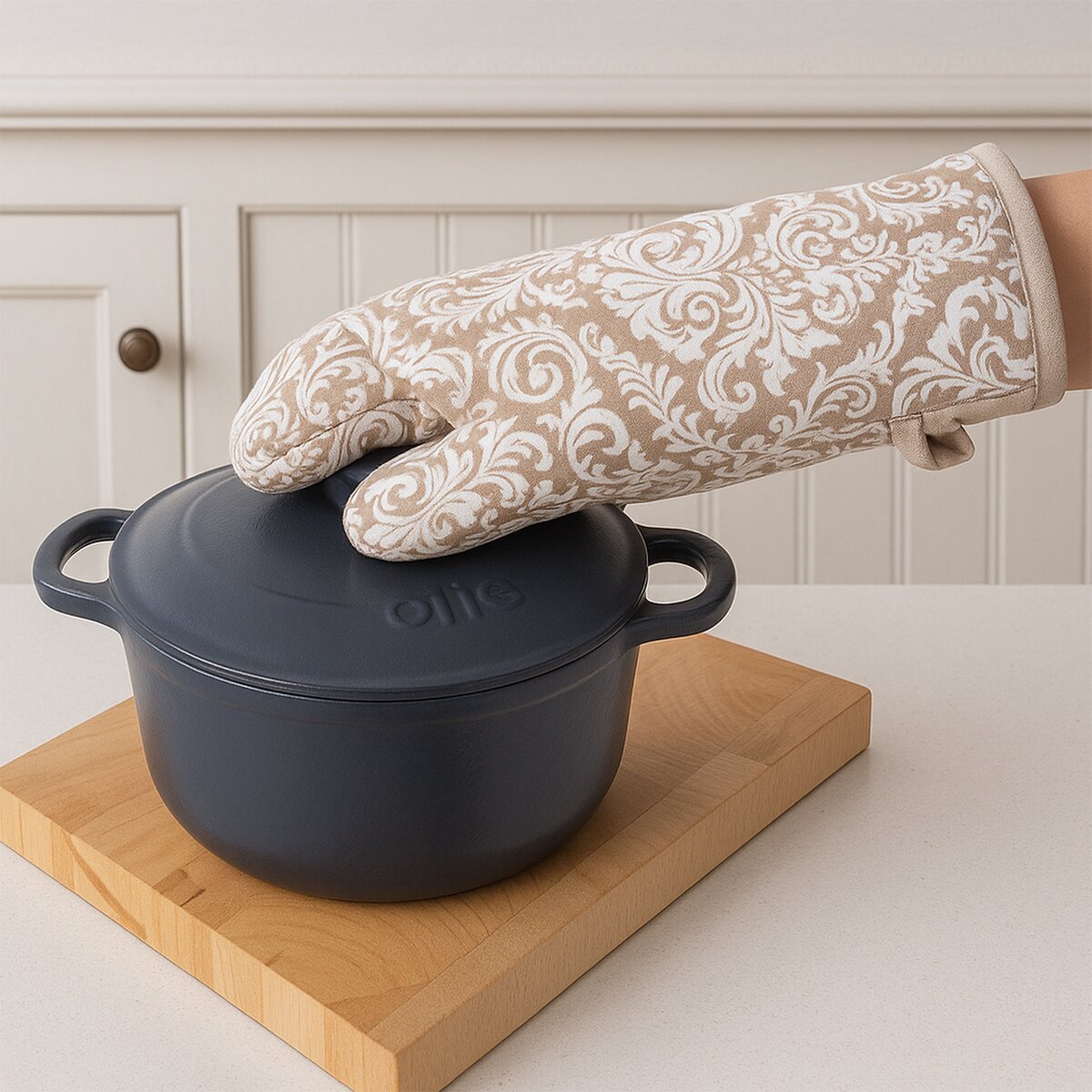 Více informacíI chňapka může být stylová. To potvrzuje tato bavlněná kuchyňská rukavice, která je stylovým a funkčním doplňkem do vaší kuchyně. Zdobí ji ornamentální úponky na béžovém podkladu.