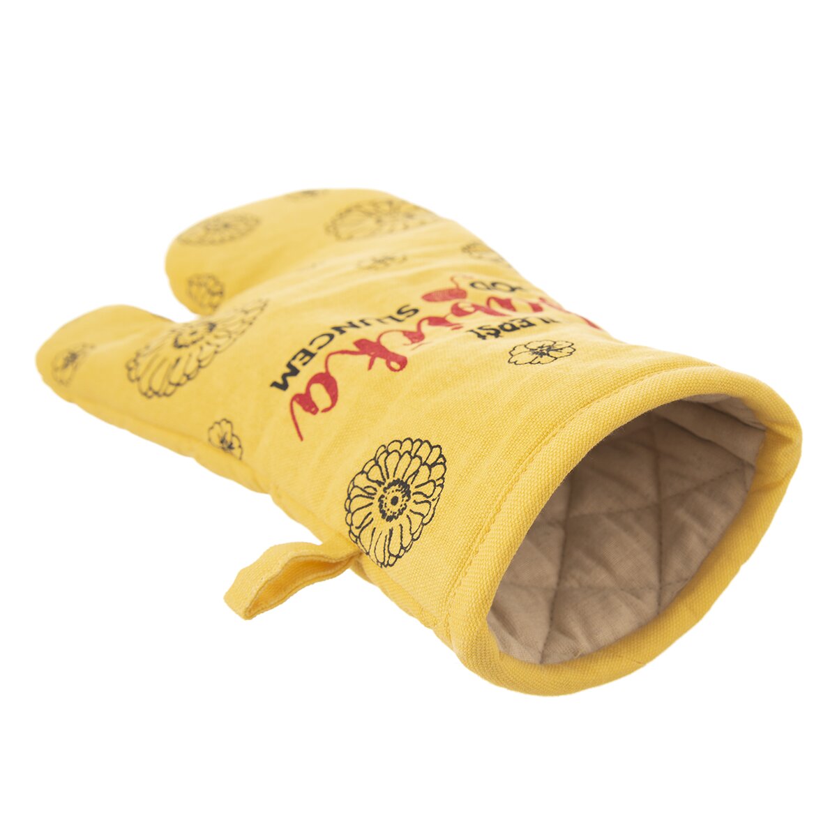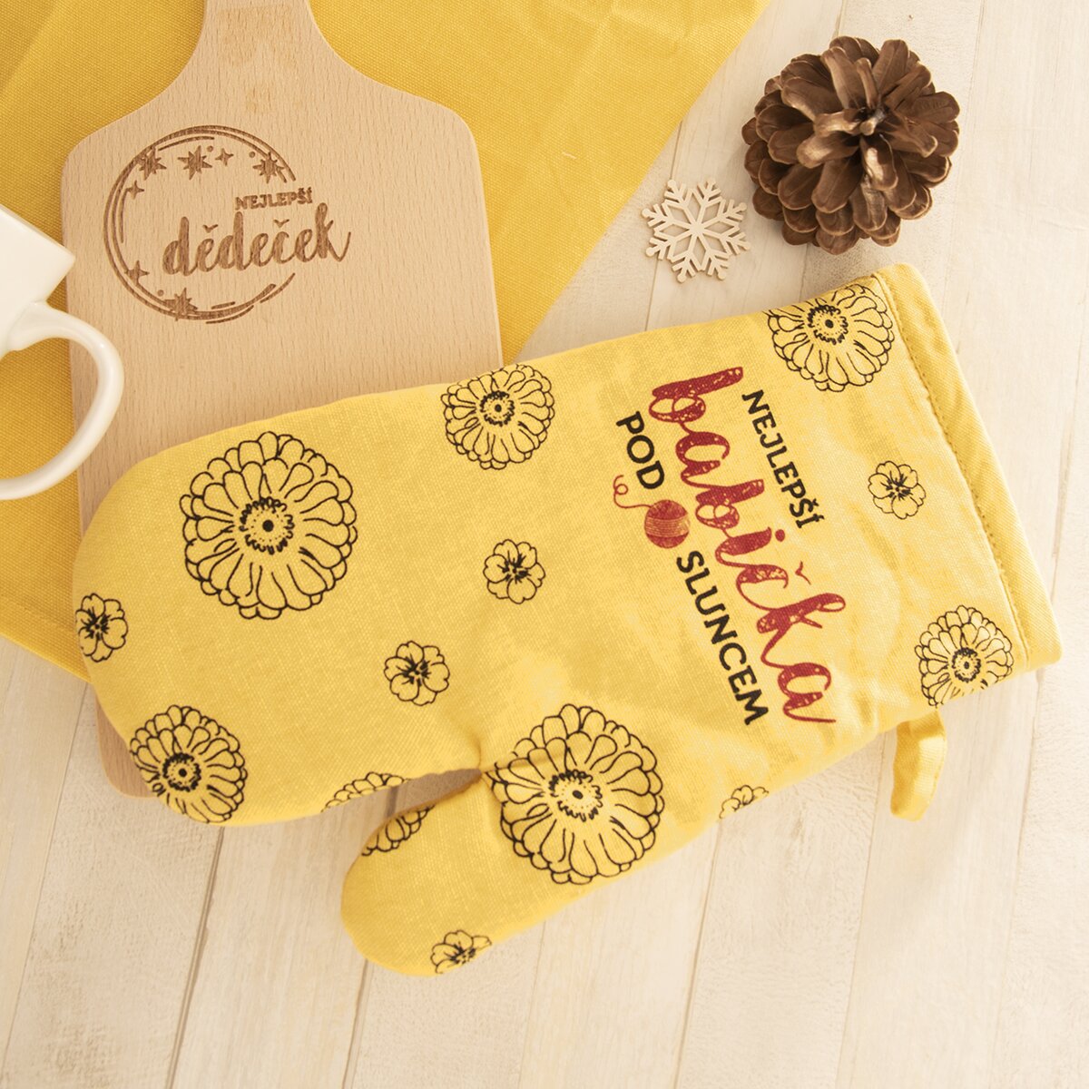 Kód produktu 153903Kuchyňská rukavice ze 100% bavlny ve žluté barvě, s květinovým motivem a nápisem NEJLEPŠÍ BABIČKA POD SLUNCEM, ochrání ruce při vaření a pečení.