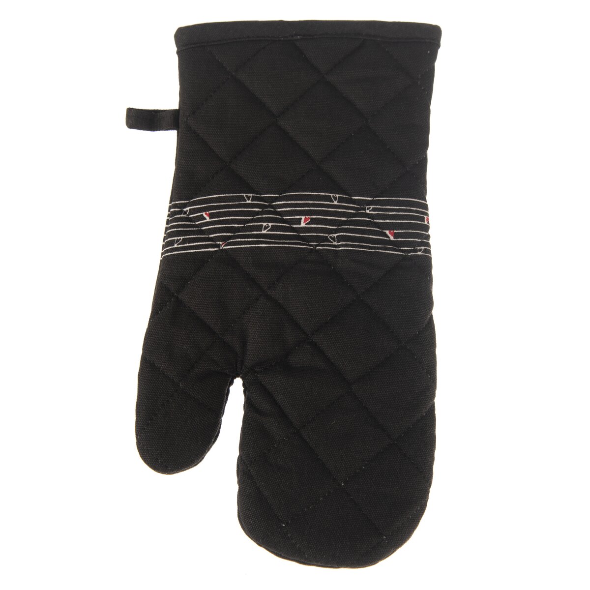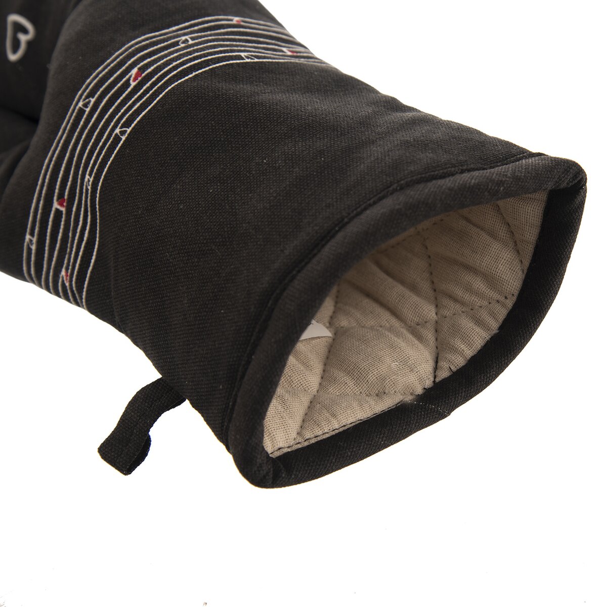 Kód produktu 152192Bavlněná černá chňapka s poutkem a magnetem, s jemným dekorem SRDÍČKA.