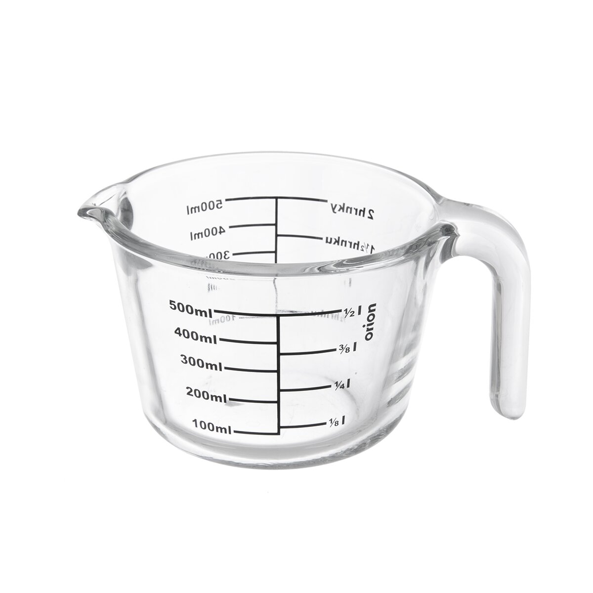Kód produktu 120562Masivní skleněná odměrka s držadlem a výlevkou je potištěna stupnicemi pro pohodlné měření objemů. Na nich jsou vyznačeny míry pro 500 ml a 2 hrnky při použití hrnkových receptů.