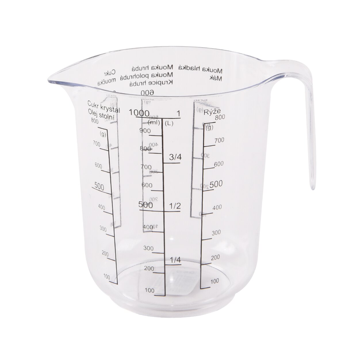 Kód produktu 120505Plastová kuchyňská odměrka o objemu 1 l s praktickou výlevkou a uchem. Odměrná stupnice má značení po 100 ml a 100 g.