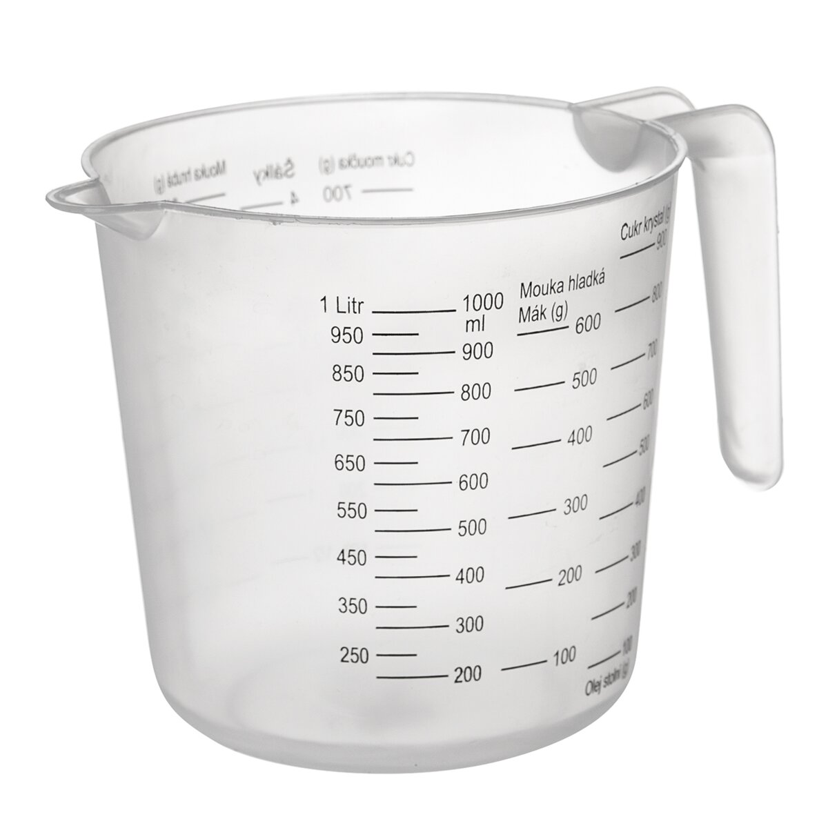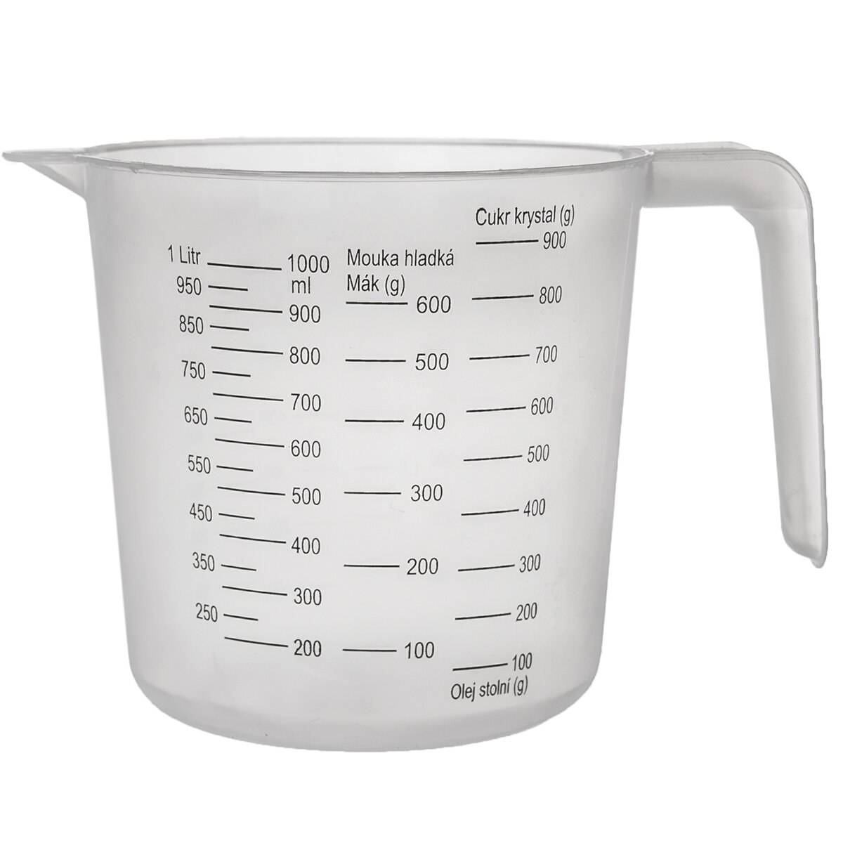 Kód produktu 120539Plastová transparentní odměrka o objemu 1l s praktickou výlevkou a uchem.