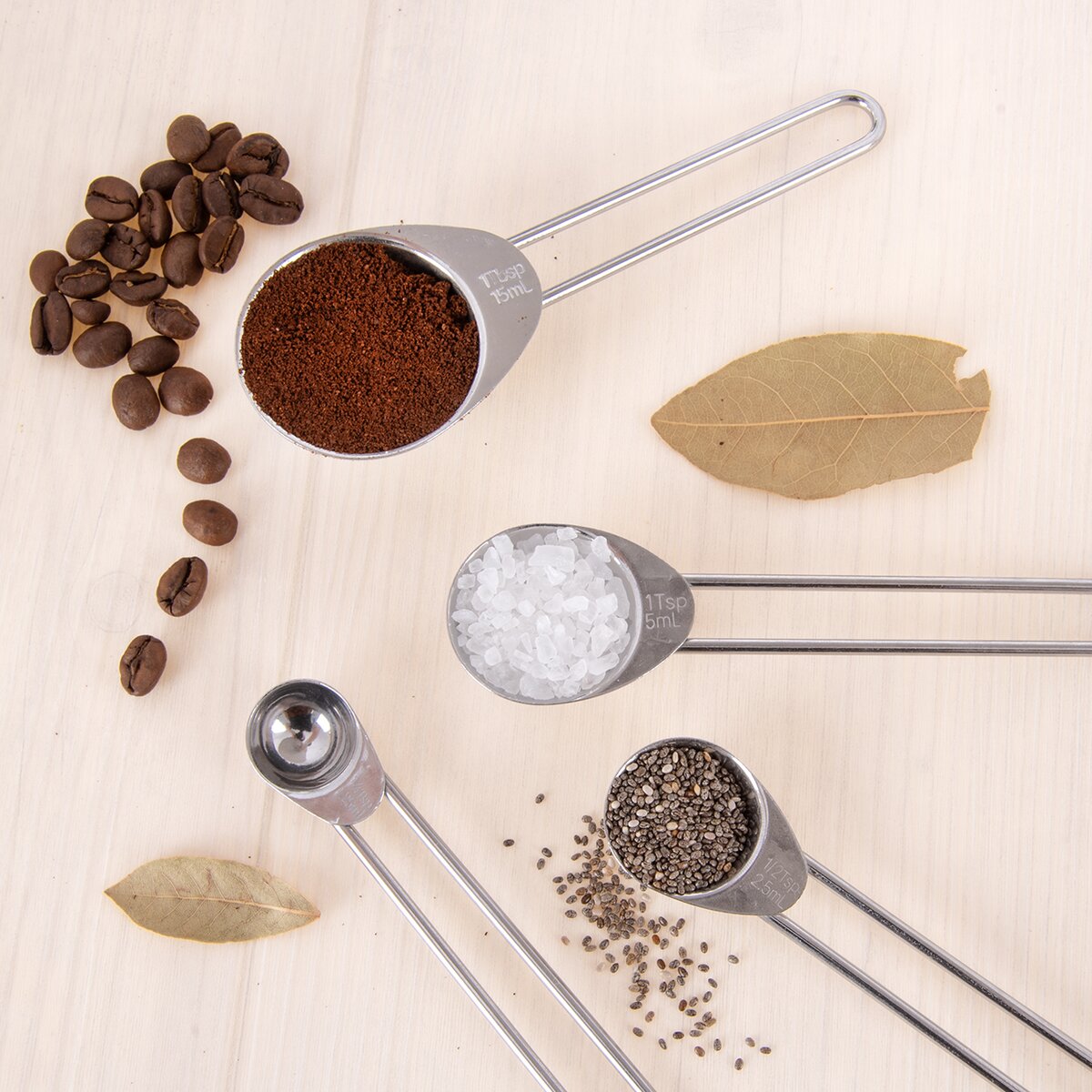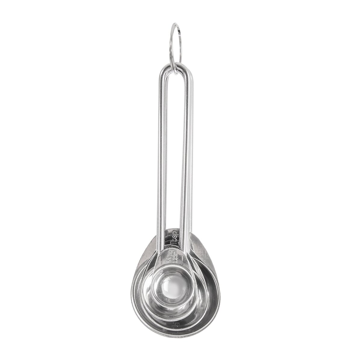 Jsou vyrobené z nerezu a zavěšené na kroužku, navíc do sebe zapadají. Hodí se k odměřování kypřicího prášku, sody, sušeného droždí, mleté kávy, vanilkového extraktu, koření a různých dochucovadel.