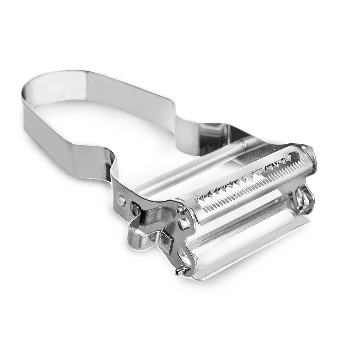 Celonerezová škrabka DOUBLE má hladké ostří, které snadno oškrábe slupku a nakrájí zeleninu či ovoce na tenké plátky. Druhé ostří dokáže velmi lehce nakrájet tenké nudličky zeleniny do polévek nebo salátů, ale i do čínských pokrmů. Zvládne i nudličky z tvrdého sýra.