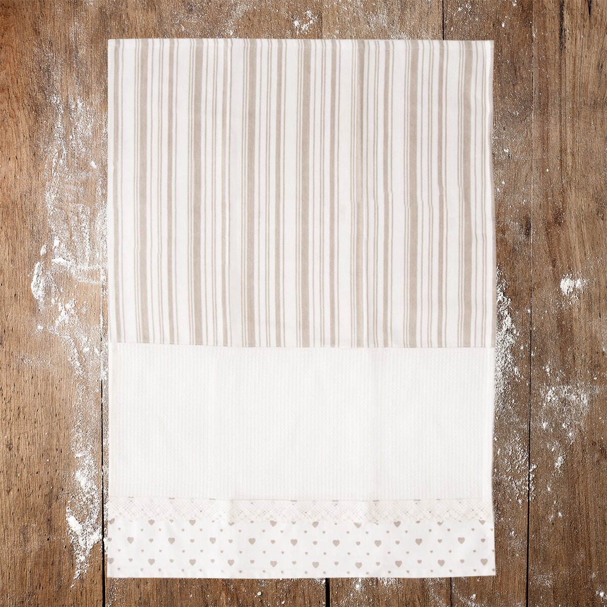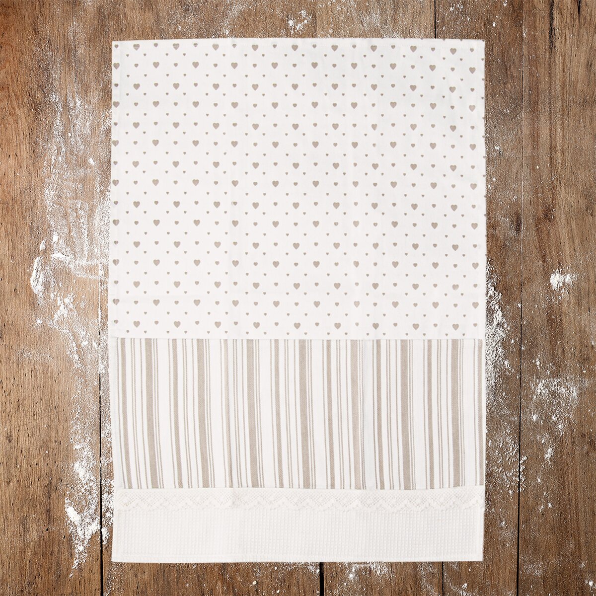 Spojení proužků se vzorem drobných srdíček se hodí nejen na chaty nebo chalupy, ale i do moderní kuchyně. Všechny utěrky jsou navíc opatřeny poutky k zavěšení.