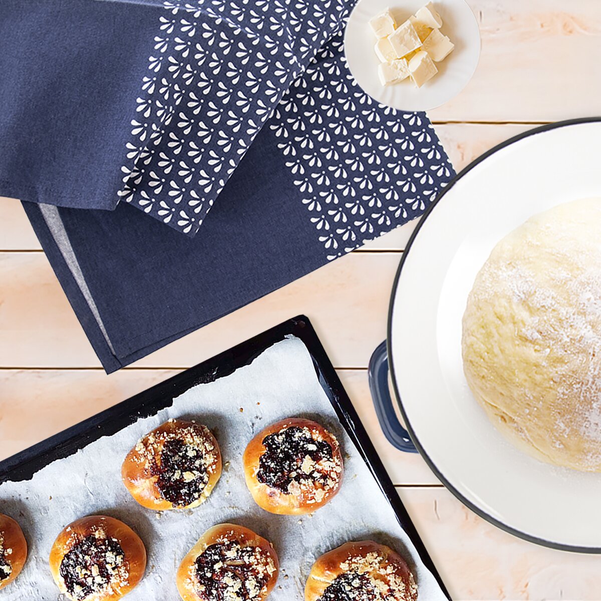 Jejich tři odlišná provedení vzdávají hold modrotisku, tradiční české technice potisku textilií. Všechny utěrky jsou navíc opatřeny poutky k zavěšení.