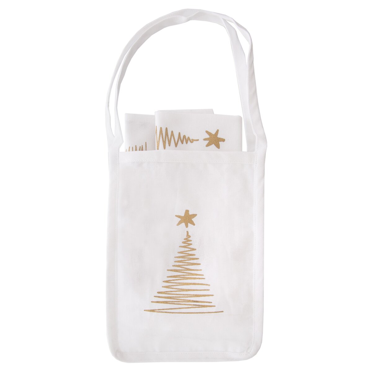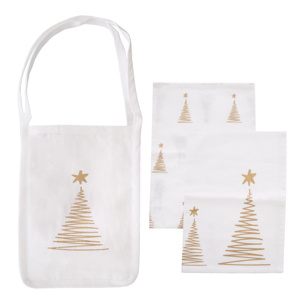 Více informacíSada 2 kusů bílých utěrek a tašky je vyrobena ze 100% bavlny a zdobí ji motiv stromečků ve zlatém odstínu. Jedná se o originální dekor z dílny Orion designérů. Bude praktickým dárkem, který lze využít v domácnosti při utírání nádobí či vytahování horkého nádobí z trouby. Utěrky lze použít i jako menší ubrus, napron doprostřed stolu.
