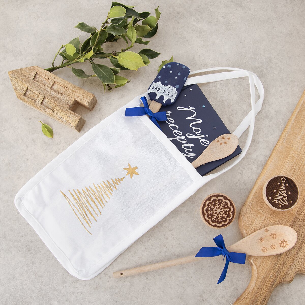 Kód produktu 710992Stylová sada 2 bílých utěrek o rozměru 70x50 cm a tašky s dekorem zlatých stromečků ze 100% bavlny. Slouží jako hezký dárek a poté i jako praktický pomocník nejen v kuchyni.