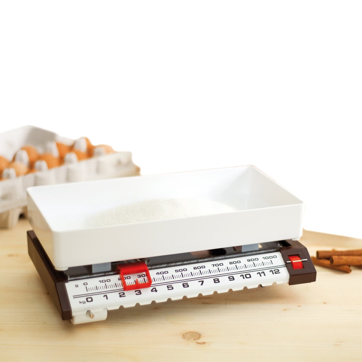Mechanická kovová kuchyňská váha s plastovou odnímatelnou miskou z ABS, kterou lze sundat a nahradit jakoukoli větší nádobou, zvlášť když chcete zvážit ovoce ze zahrádky, maso od farmářů nebo mouku pro pečení sladkých a slaných dobrot.