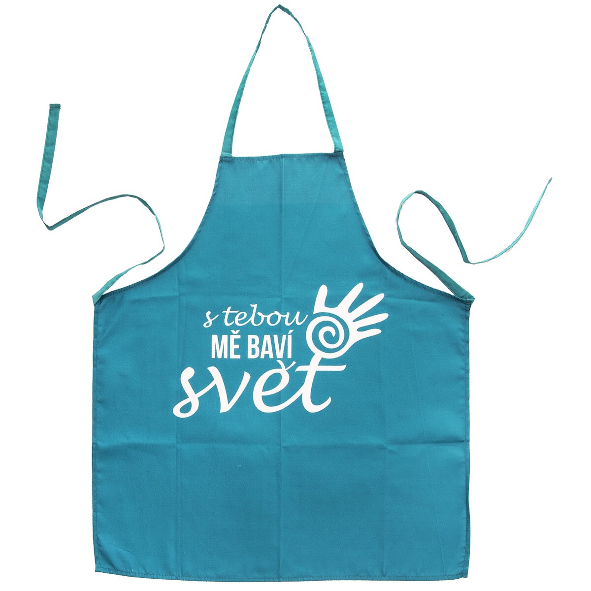 Kód produktu 960378Kuchyňská zástěra s nápisem S TEBOU MĚ BAVÍ SVĚT v petrolejové barvě.