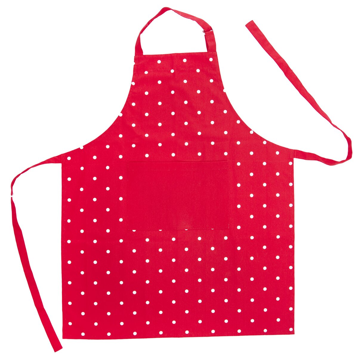 Kód produktu 960369Červená bavlněná zástěra do kuchyně s puntíky, kapsou a nastavitelným vázáním kolem krku.